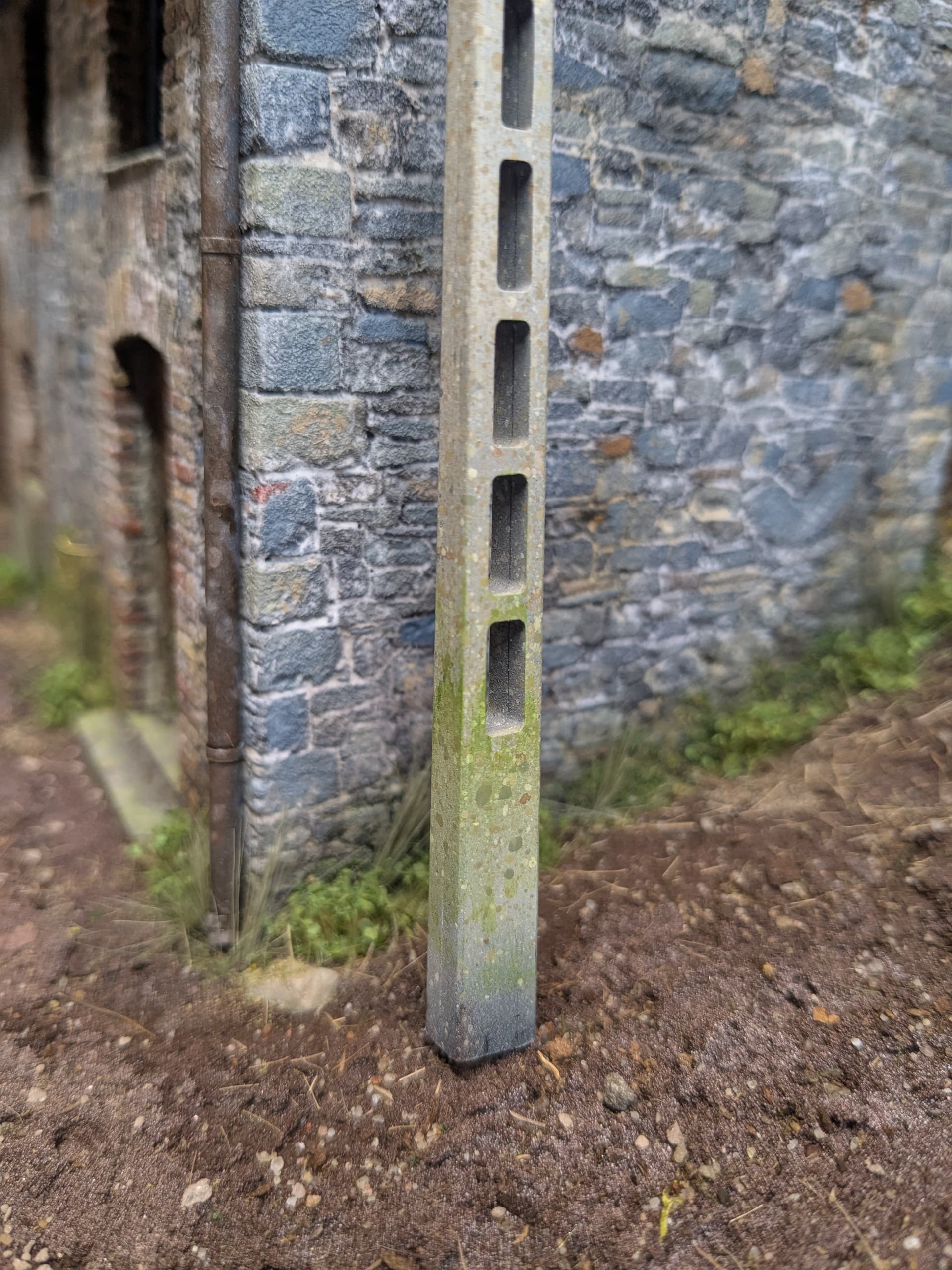 To get the concrete texture on the pole I simply sprayed it a mid-grey colour and then speckled the hell out of it with a range of acrylics and a toothbrush. This method is a lot of fun and works like a dream - as long as you keep the the paints diluted and the speckles small.