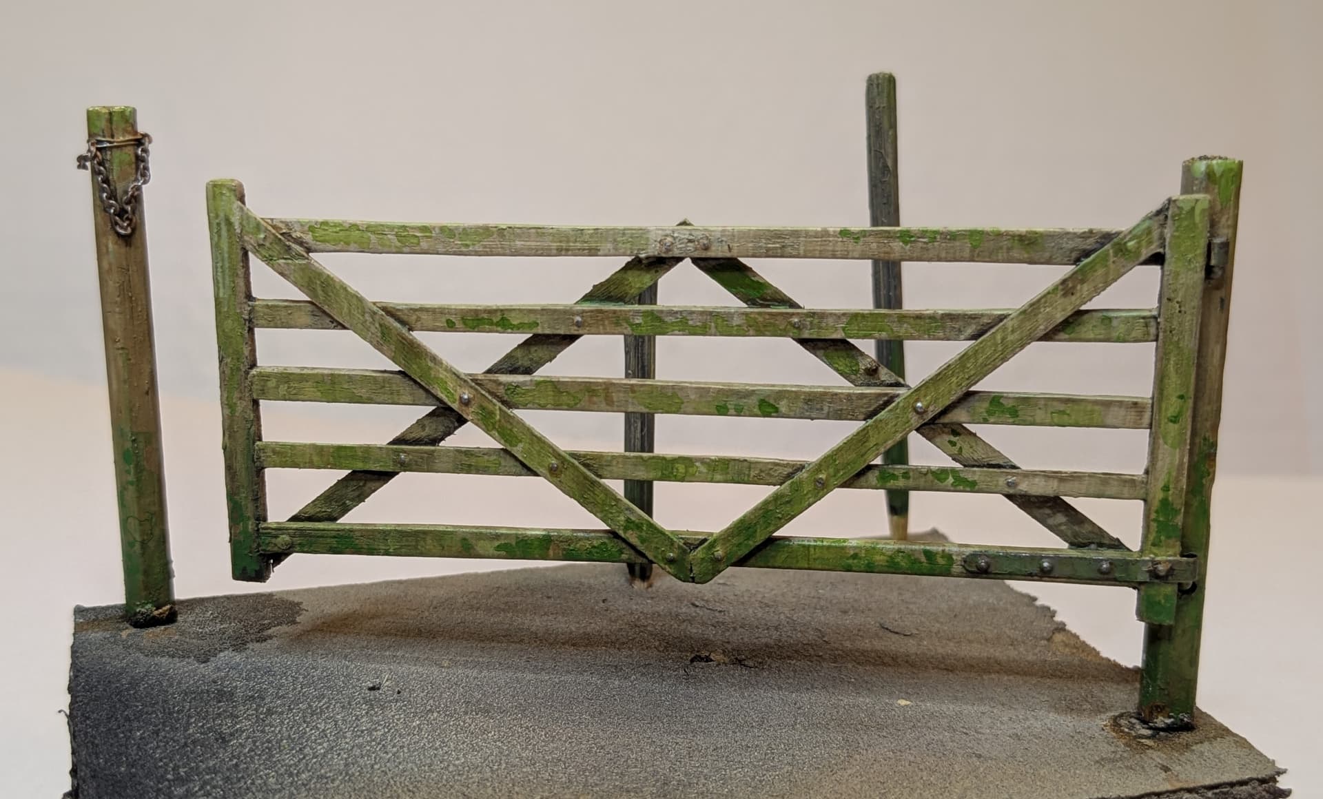 Not to be confused with the moss on the roof, tree and elsewhere, algae is that green discolouration that tends to form on wooden fences, etc in winter time. To be honest, it took me quite a long time to really notice this, because it tends to blend in with the surrounding vegetation - but when you look its actually pretty vivid. So I chose some fairly vivid acrylics to match and applied it with washes and stippling to achieve the desired effect.