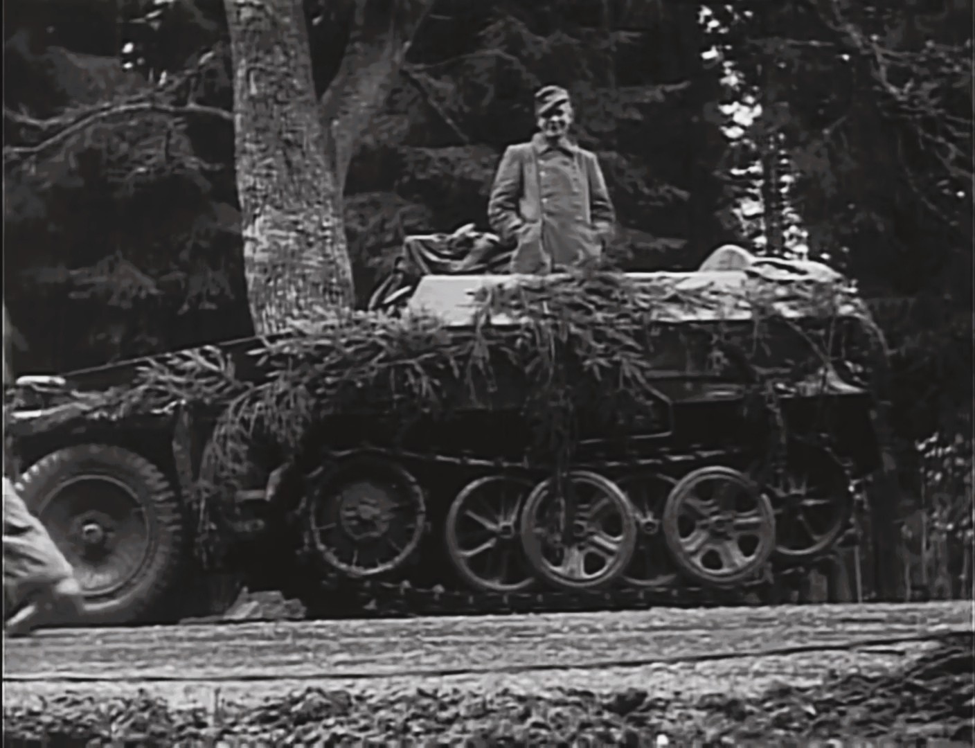 The shot above may not look very exciting, but it has been a huge inspiration for this diorama. A still taken from the well known German newsreel (later captured by the Allies), it shows a heavily camouflaged 250/1 halftrack parked by the side of the road at the Kaiserbaracke Crossroads.