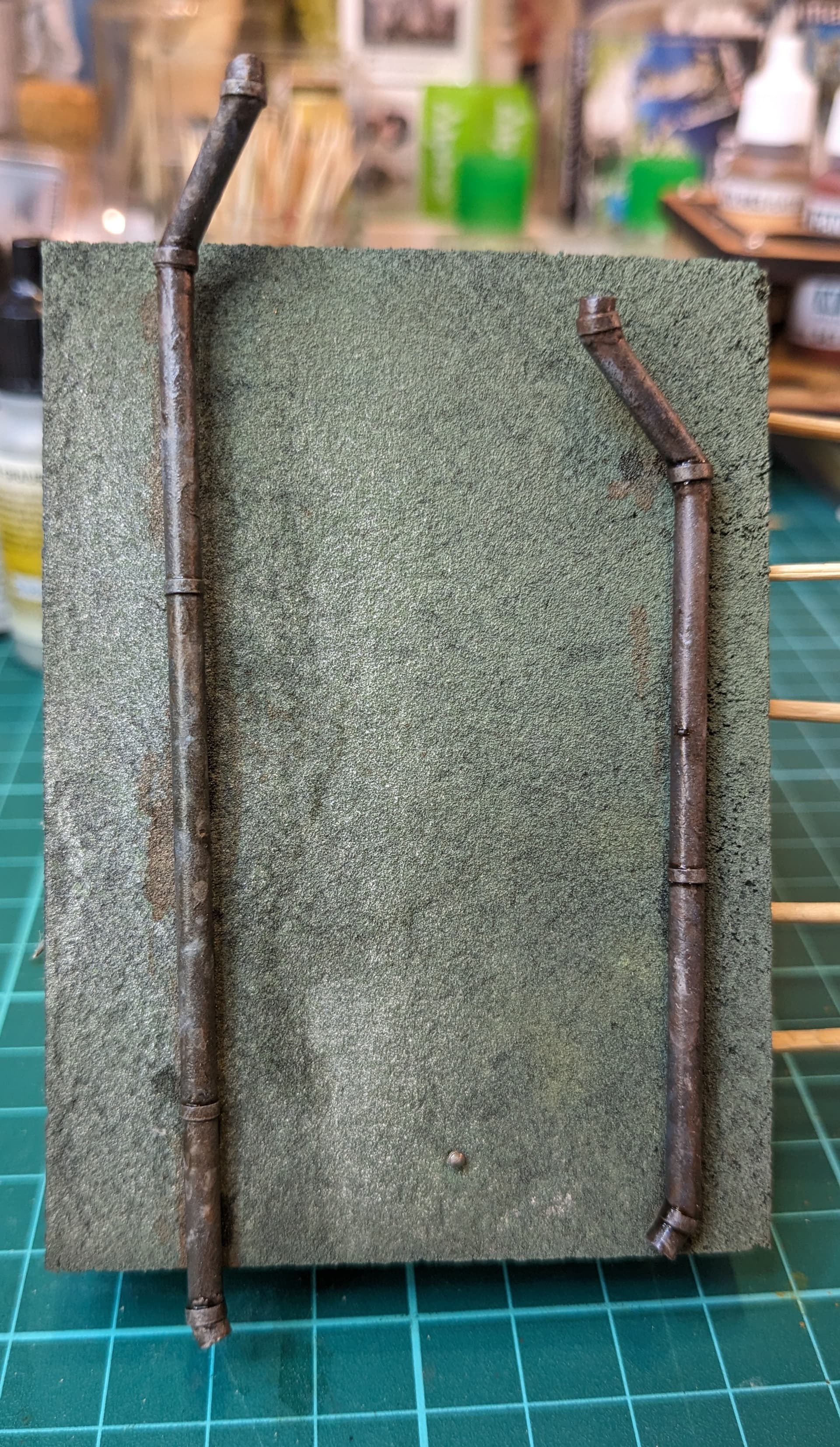 Oh yes, and the other great thing about drainpipes? They are the perfect way to cover up the joins between the different pieces of foam board met. In fact to hold them in place - and make sure they lined up with the gaps - I glued metal pins into them and simply pushed them into the foam board with a bit of glue.