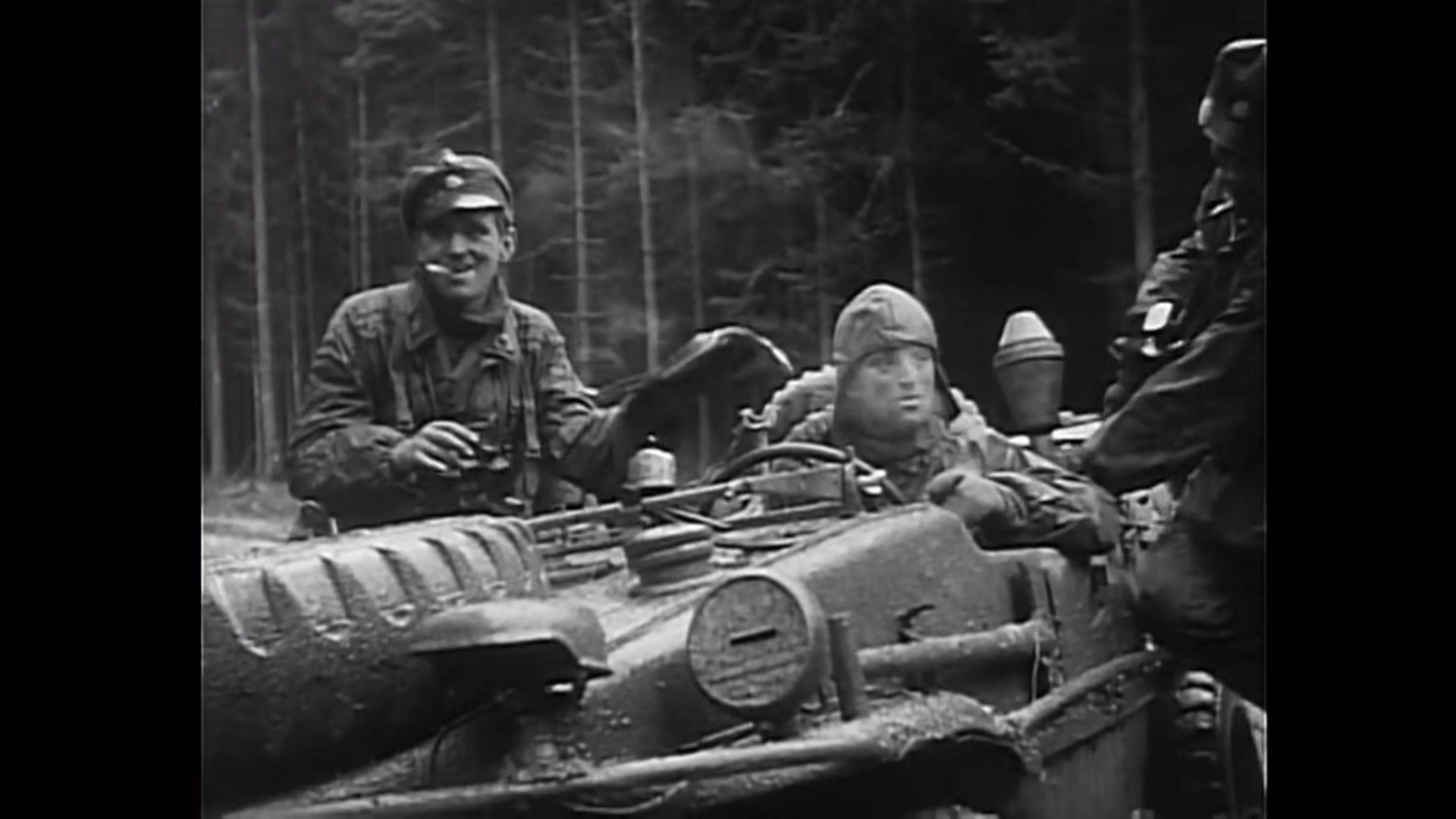 I covered this in detail way, way above but one of the best known parts of this footage is undoubtedly the clip showing a Schwimmwagen parked near a roadsign with a cigar-chomping NCO and driver wearing a flying helmet. The former has often been mis-identified as Joachim Peiper, but his rank patches show that he was an Unterscharführer (or Sergeant) and he has never been identified as far as I know.