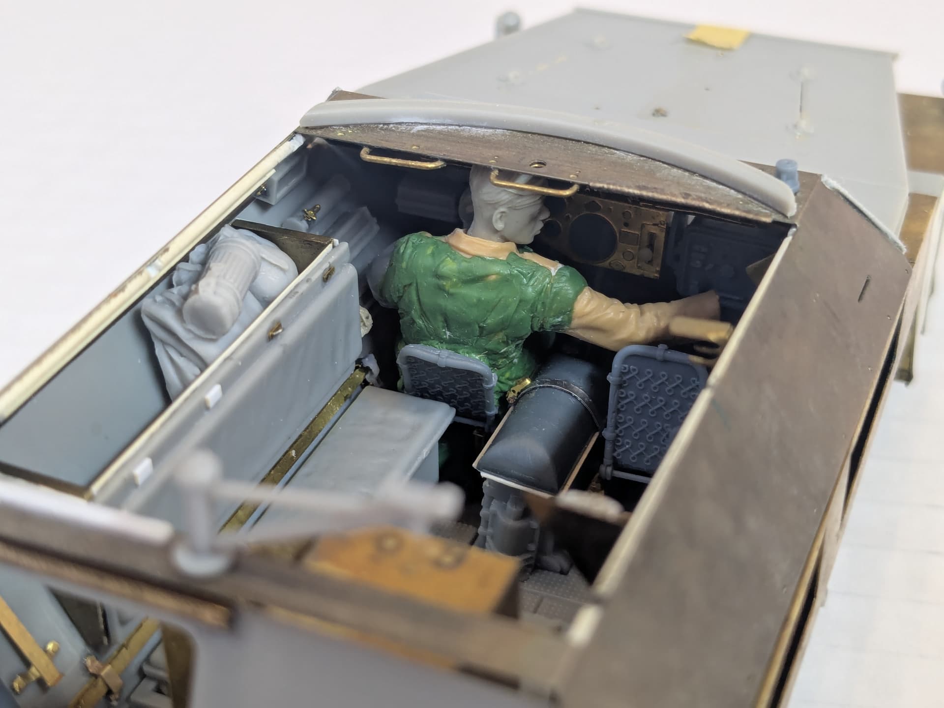 I am glad that I decided to add the driver at this stage, because he was a real pain to fit. The figure is a mix of various parts from the spares box, plus a Hornet head. I then sculpted a greatcoat from a mixture of Green Stuff and Magic Sculpt.