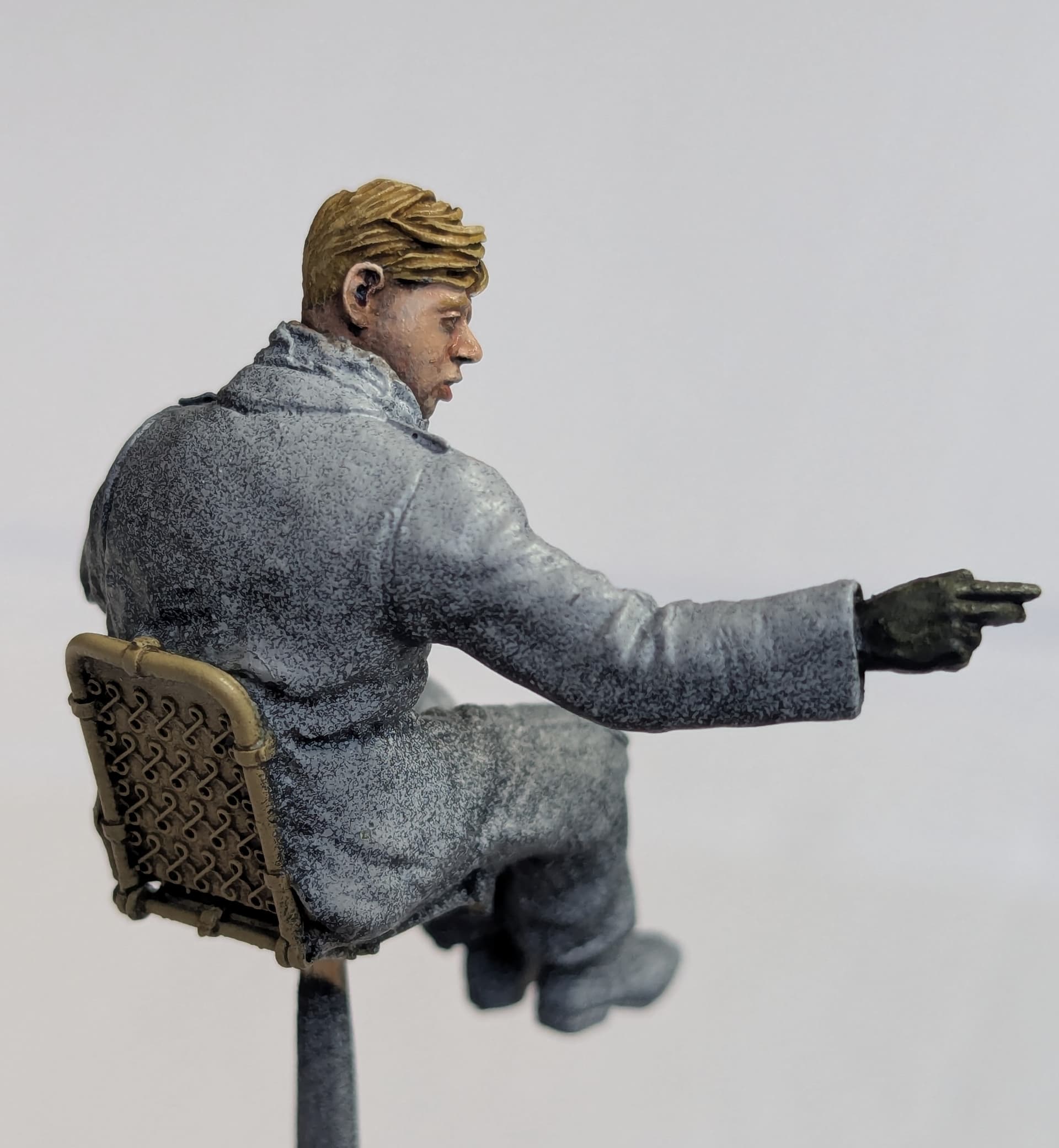 I have learnt the hard way that the only way to really get a figure to sit properly is to attach him to the chair at an early stage and then work around that. I like to think that I got away with it this time!