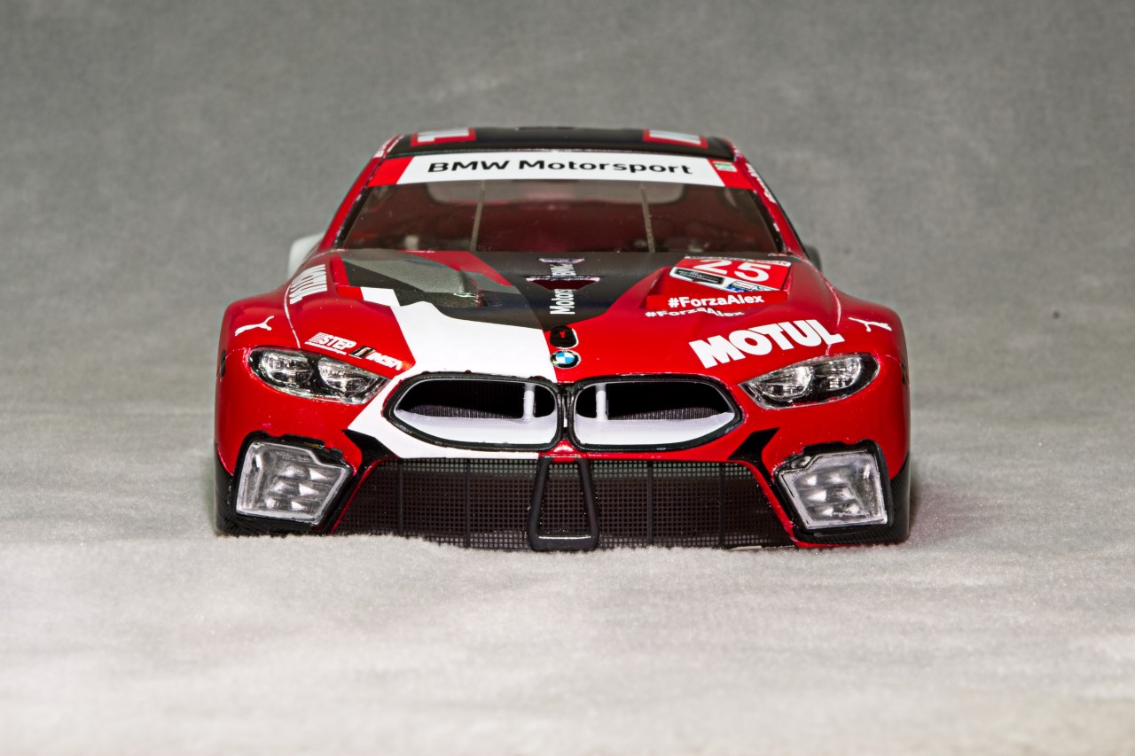 Here’s a few pics of the body as a teaser. I did notice that I must have chipped the white decal where it wraps around into the BMW twin air intakes that was a tough sub assembly to install. A little well thinned Tamiya Acrylic gloss White will take care of that issue.