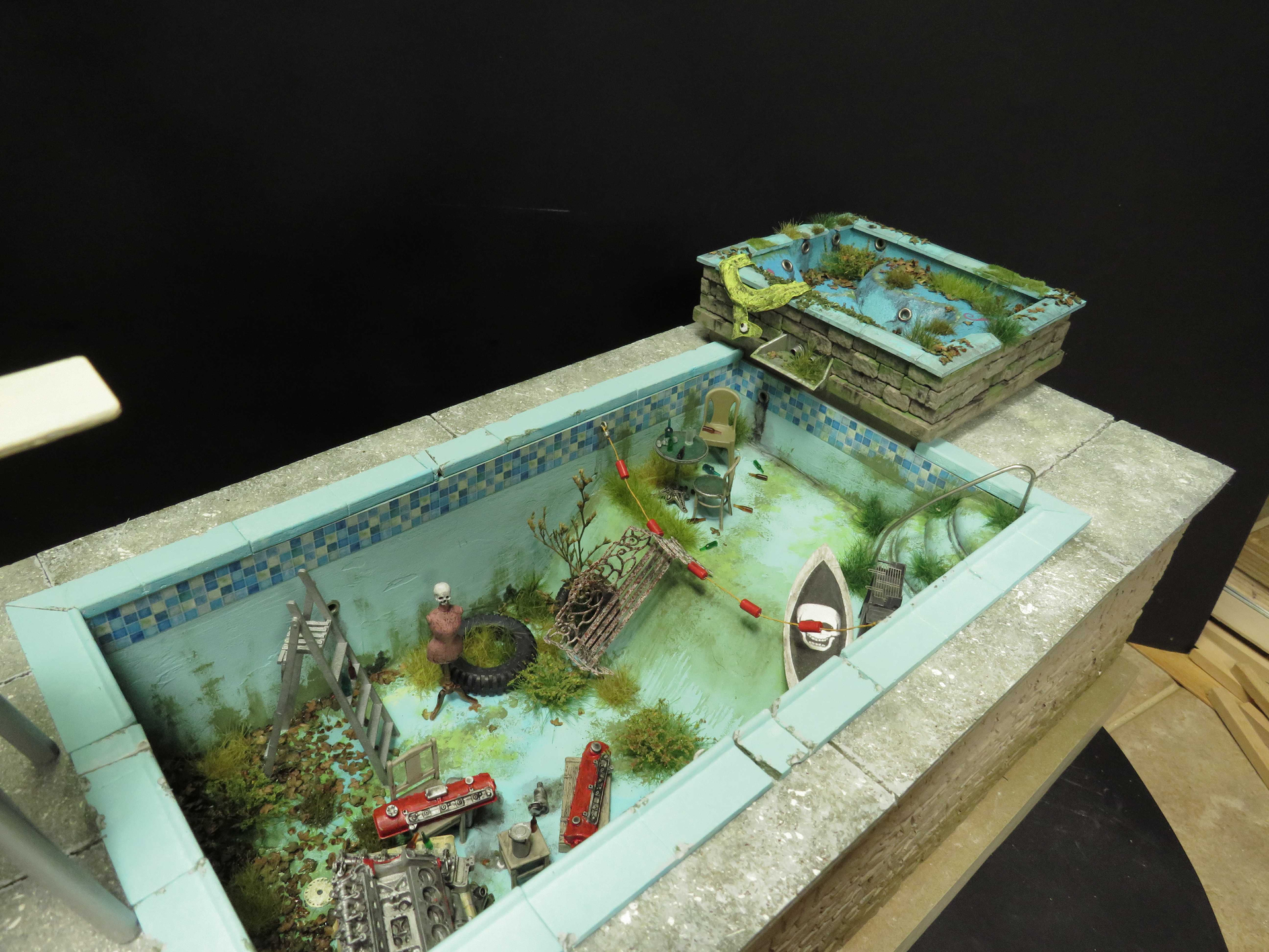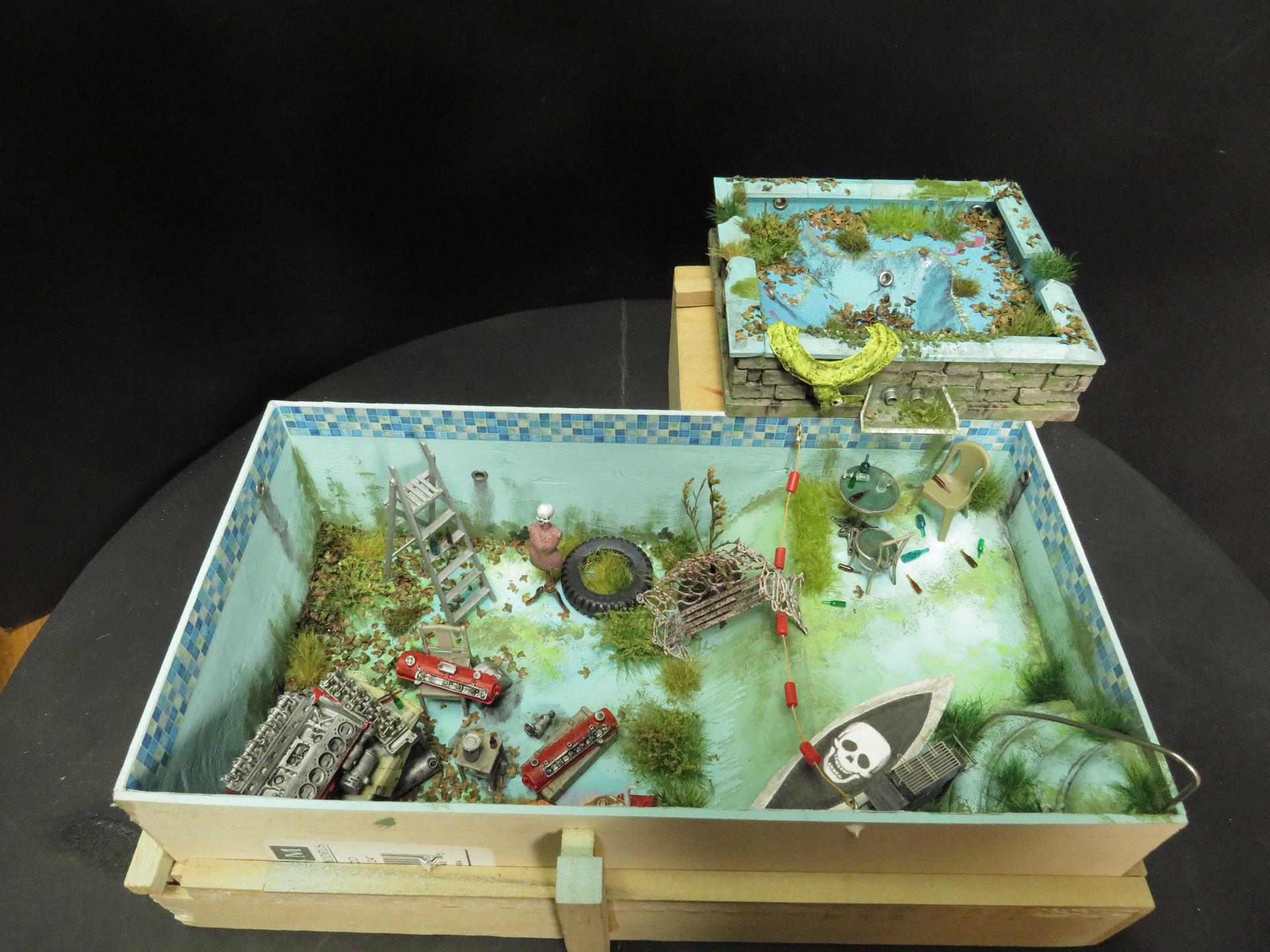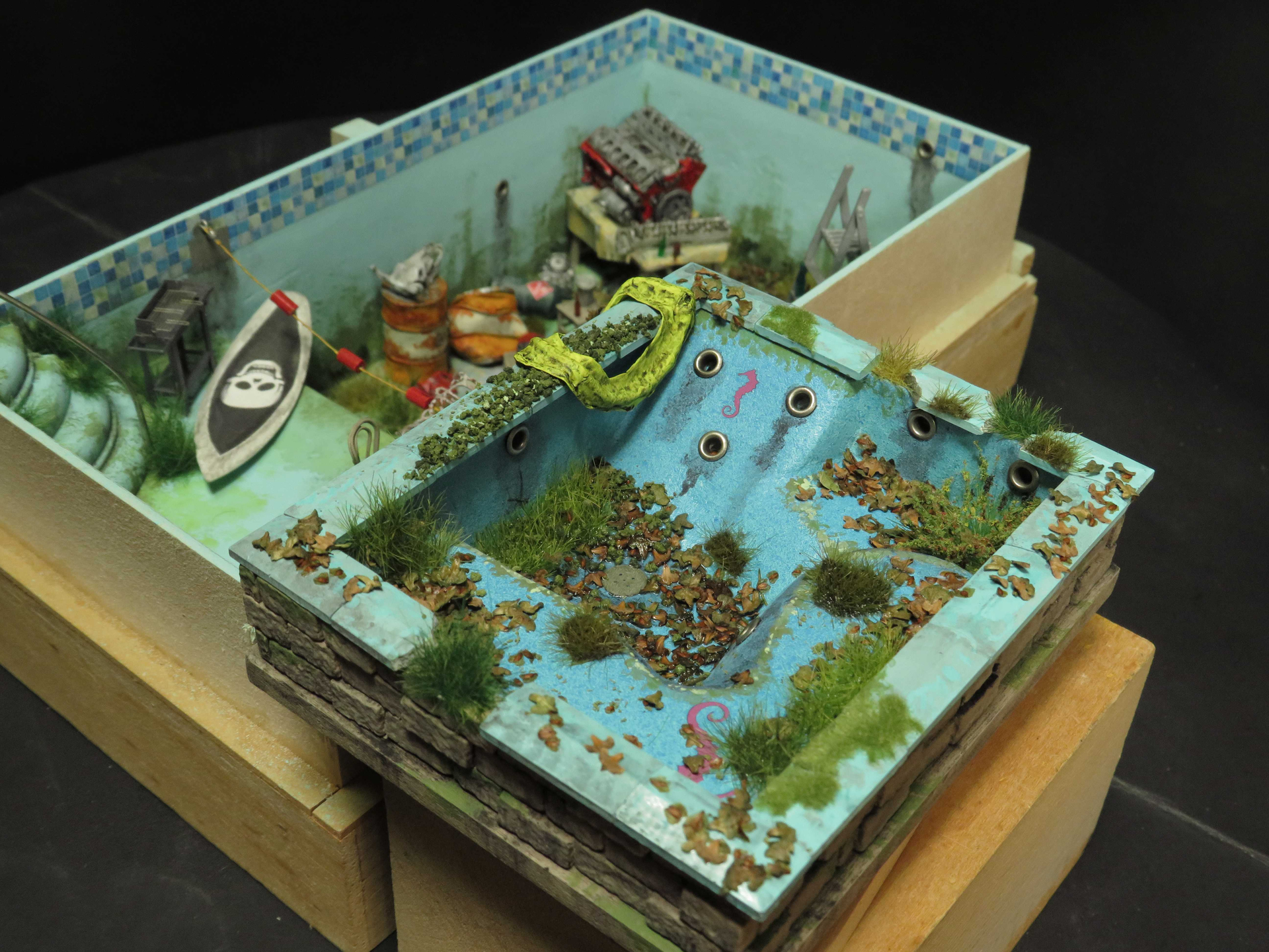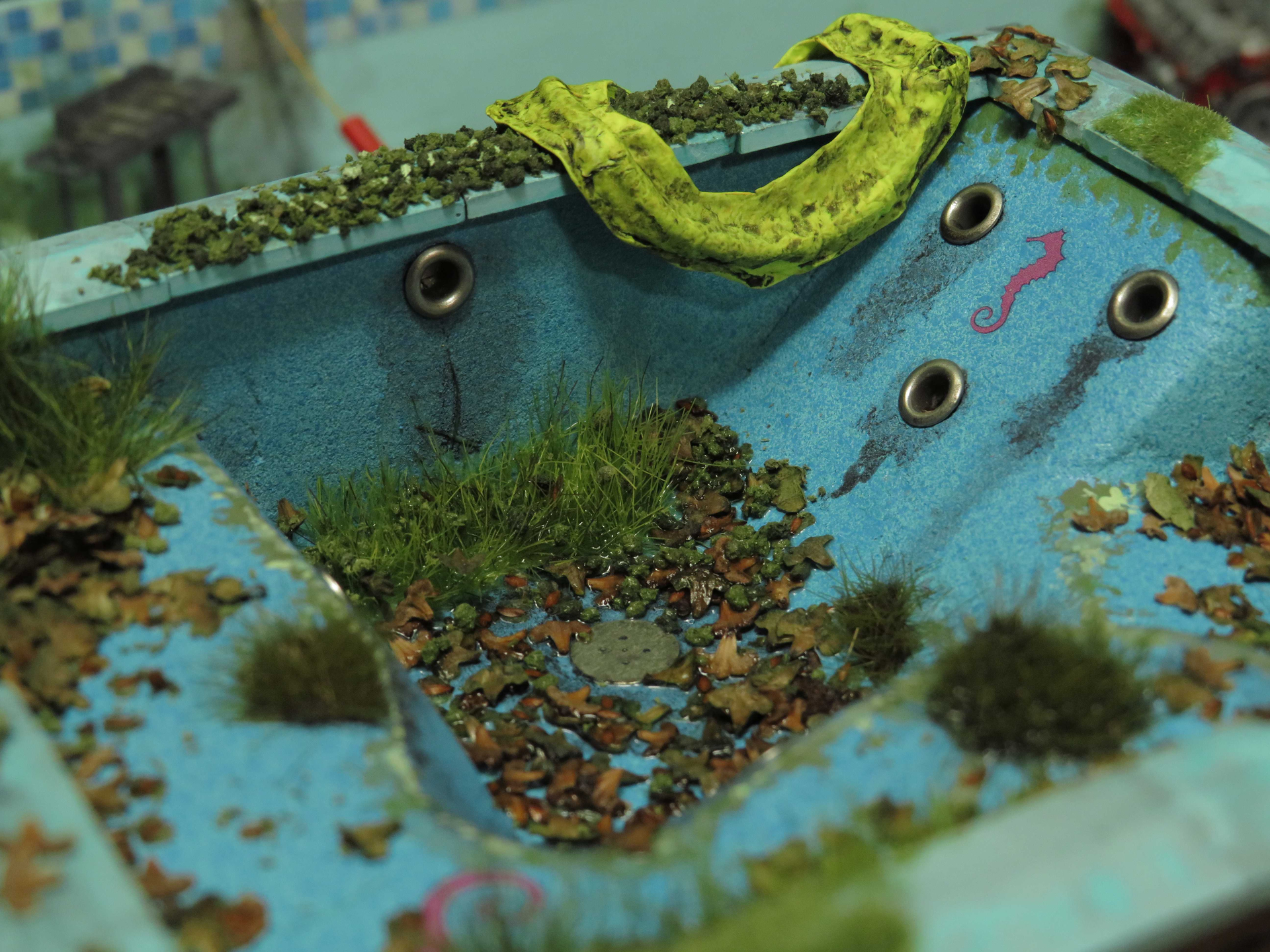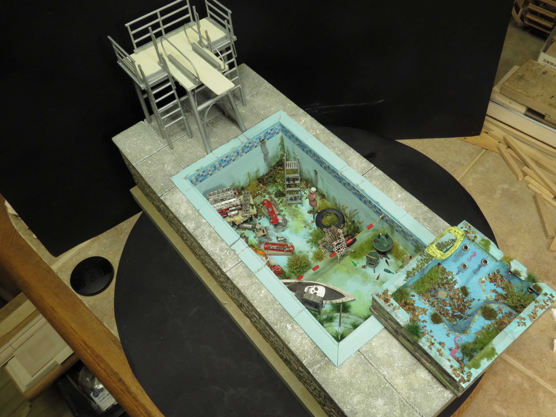 I was looking forward to seeing how you tackled this! The leaves, green scum and vegetation looks very cool against the blue and there is lots of bits and pieces long forgotten left there. Such great colors too- not just the pools but the junk and various other bits and bobs. Awesome stuff!