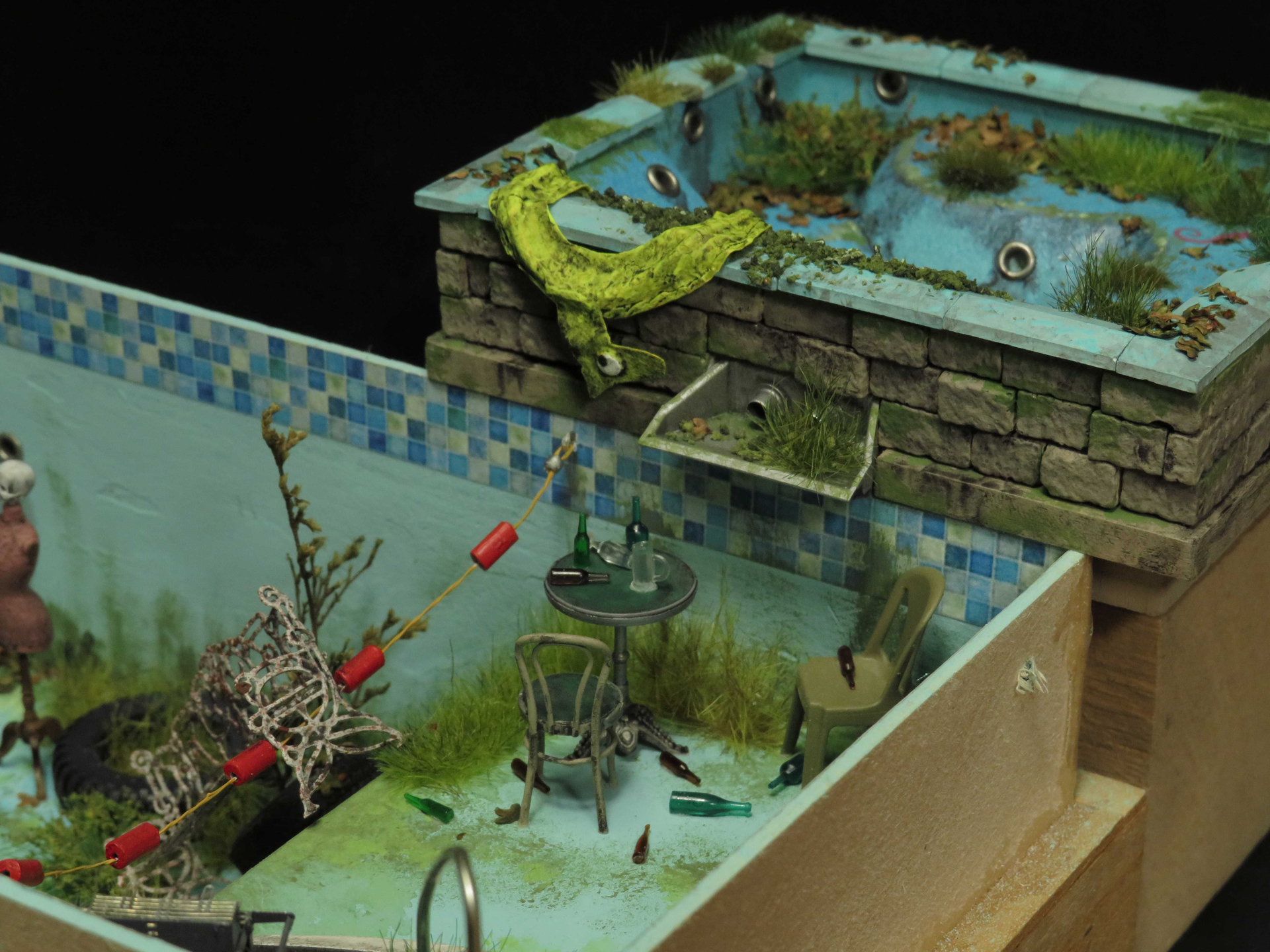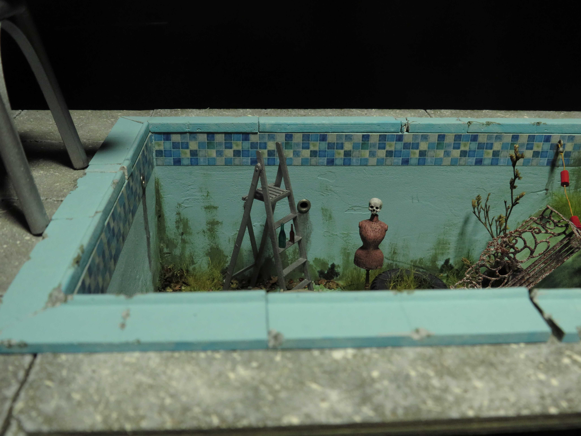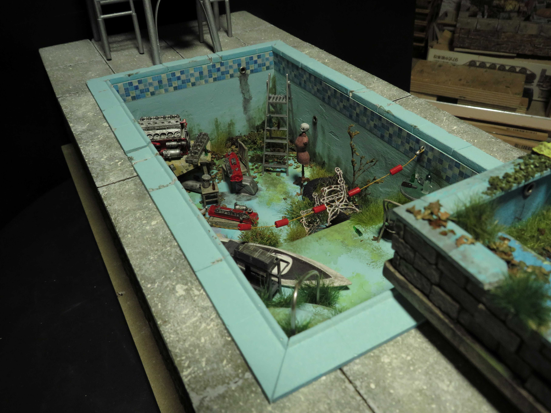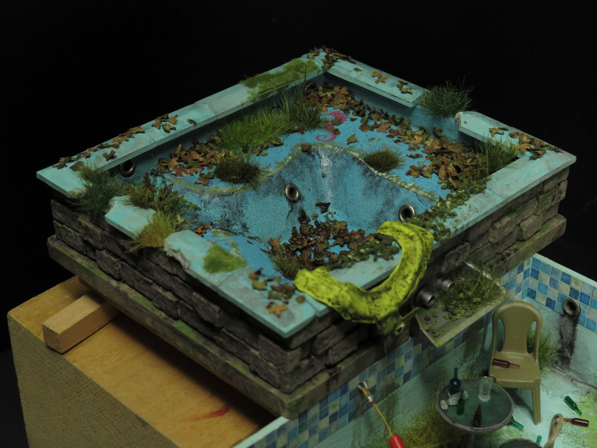 I was looking forward to seeing how you tackled this! The leaves, green scum and vegetation looks very cool against the blue and there is lots of bits and pieces long forgotten left there. Such great colors too- not just the pools but the junk and various other bits and bobs. Awesome stuff!