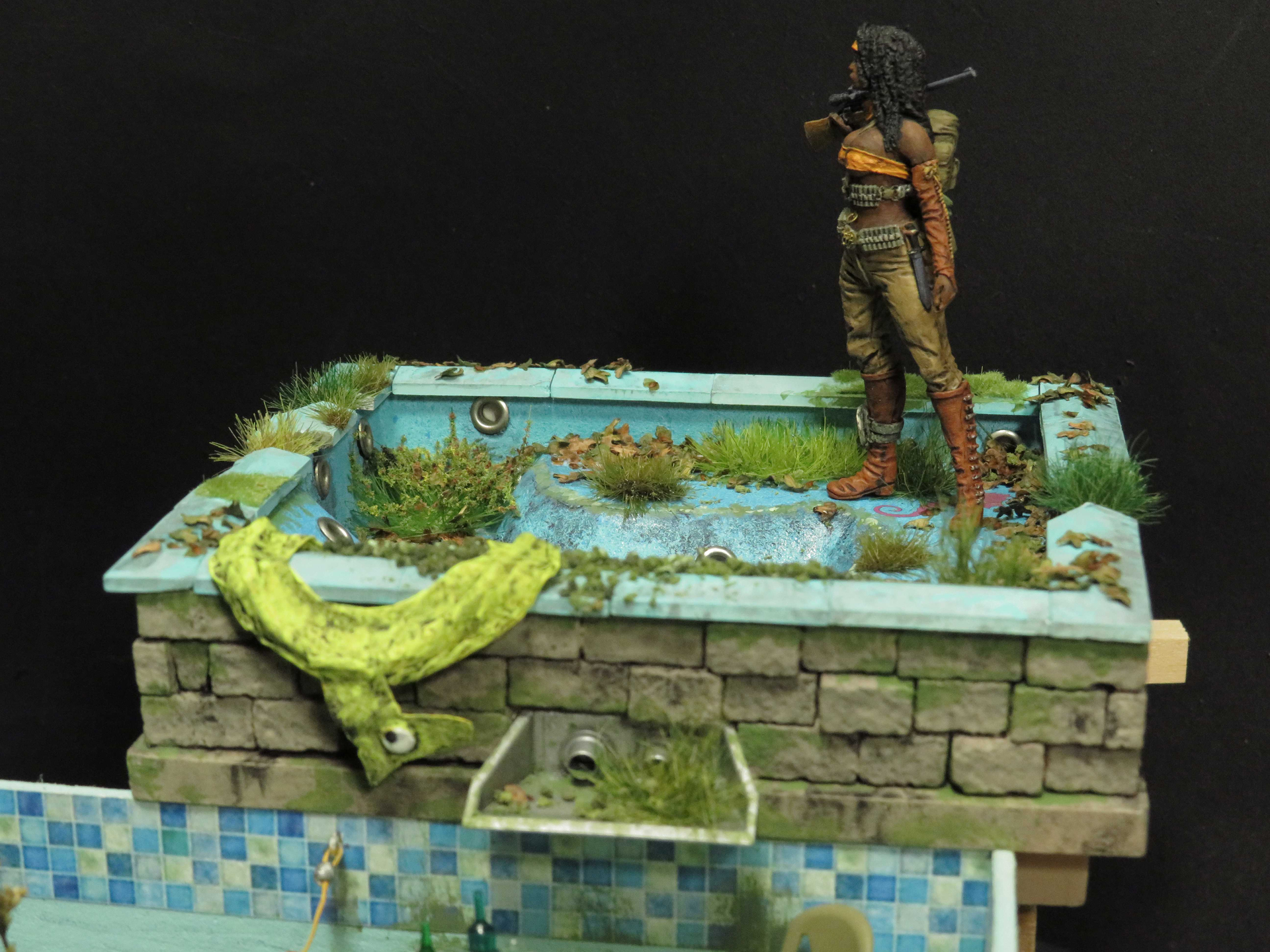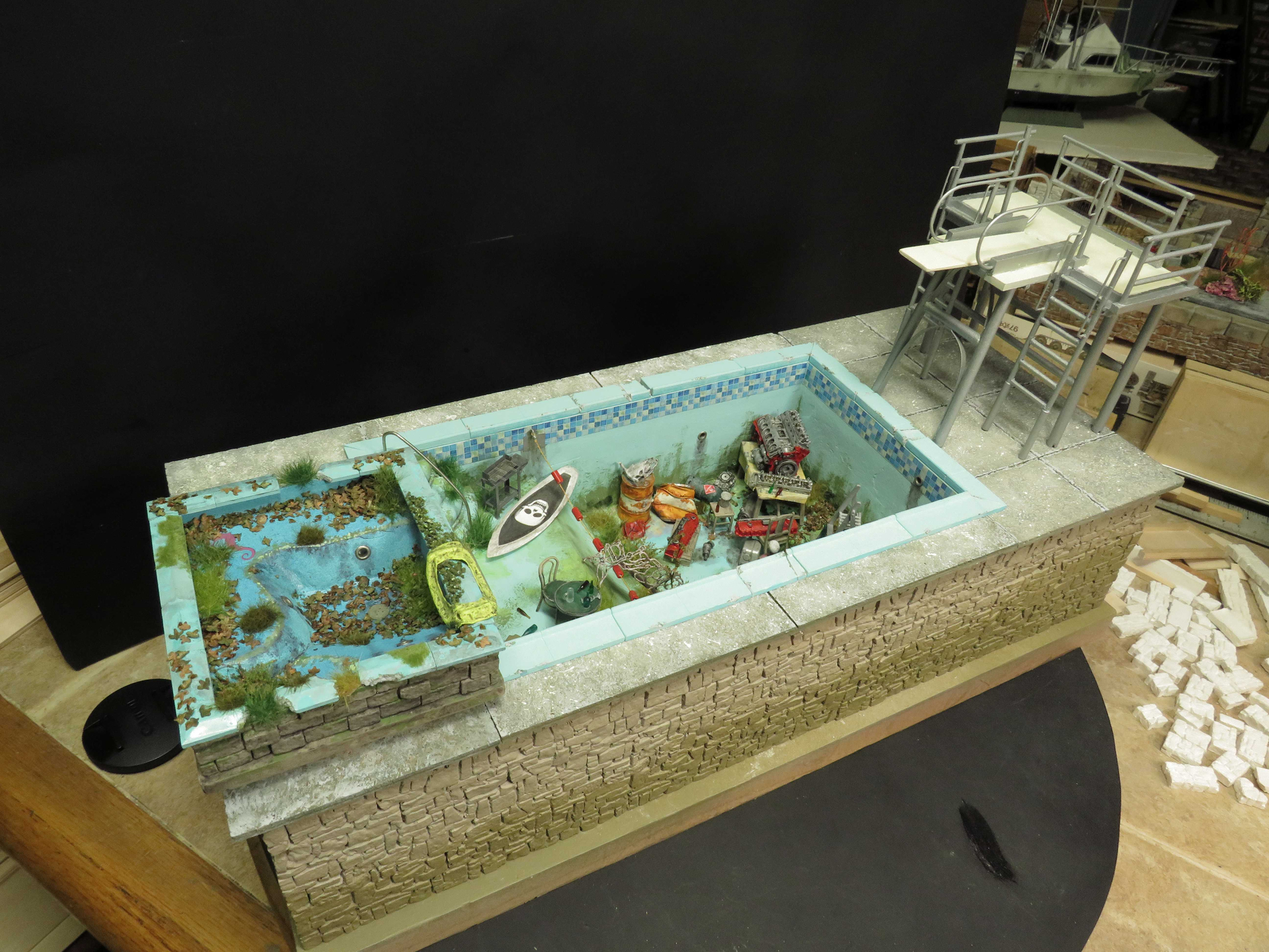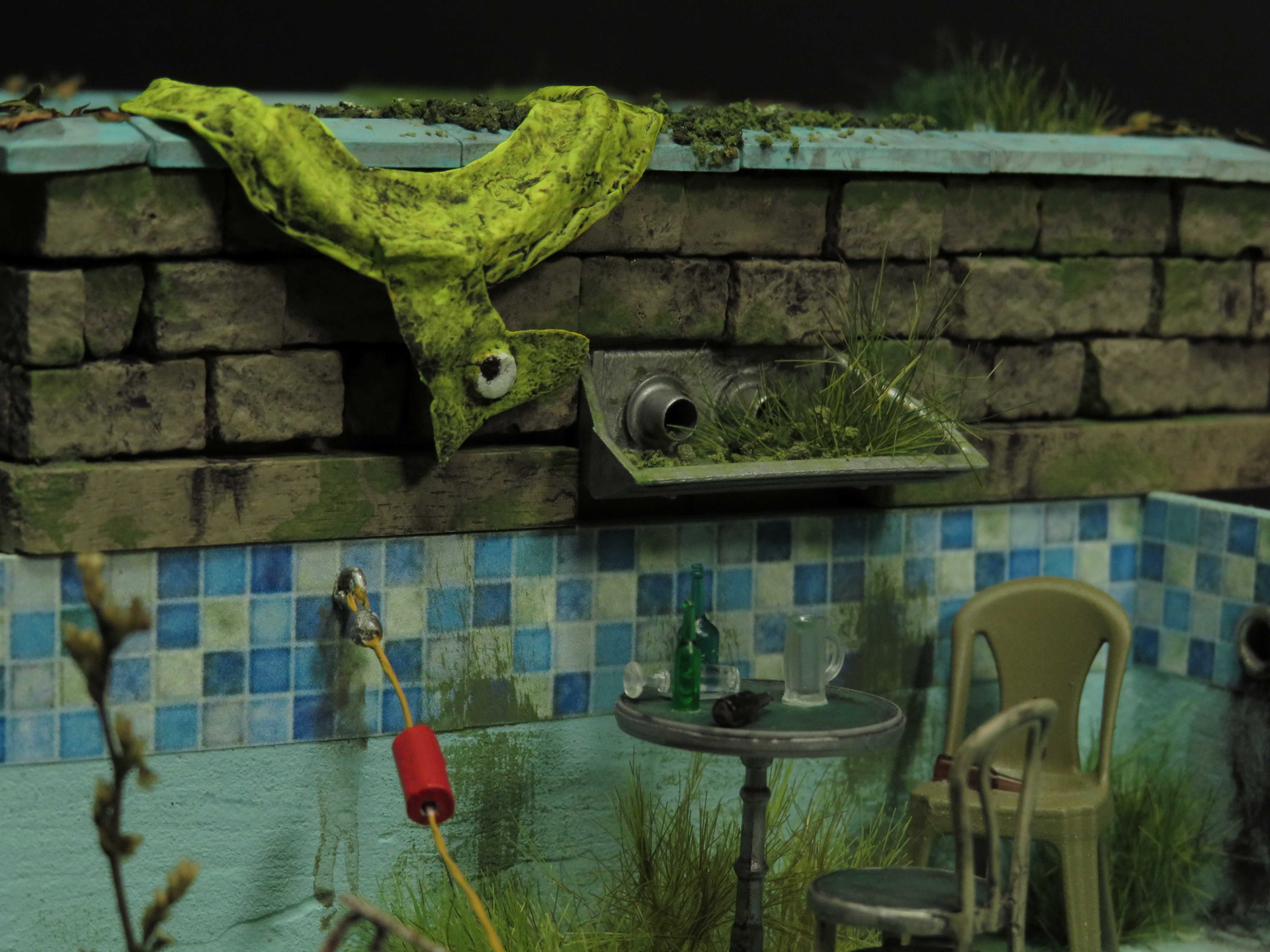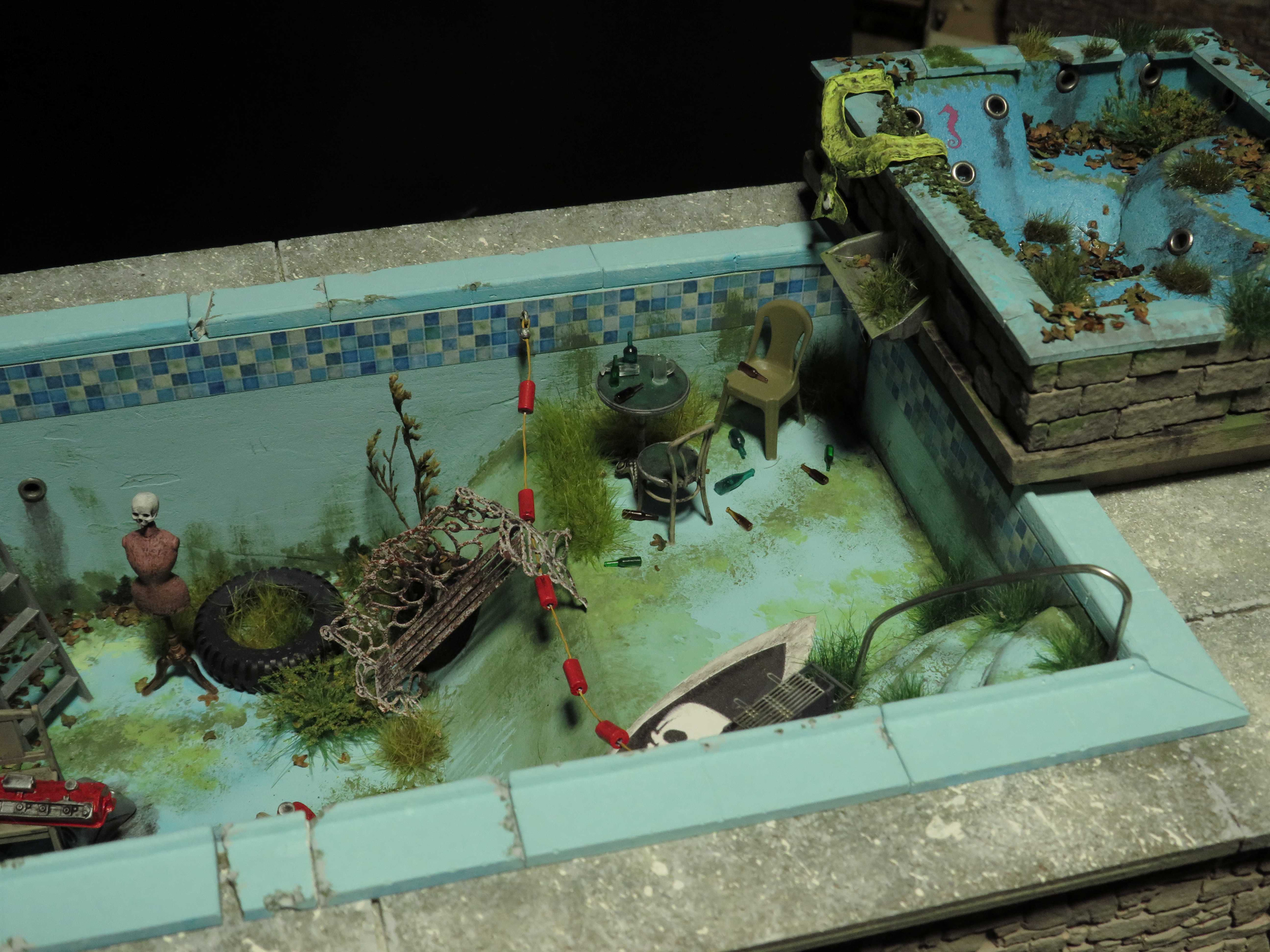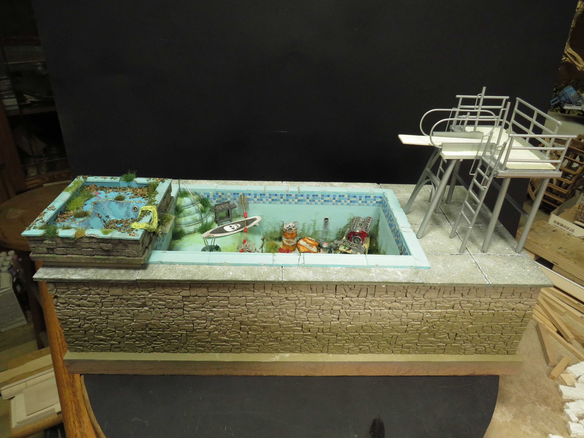 I was looking forward to seeing how you tackled this! The leaves, green scum and vegetation looks very cool against the blue and there is lots of bits and pieces long forgotten left there. Such great colors too- not just the pools but the junk and various other bits and bobs. Awesome stuff!