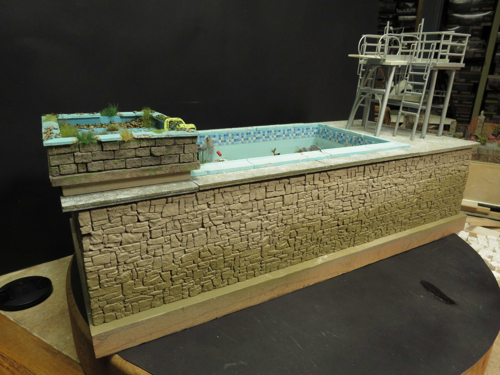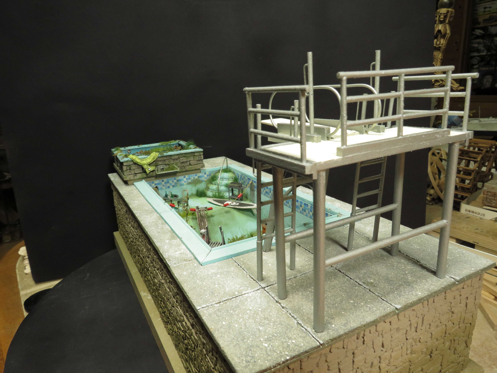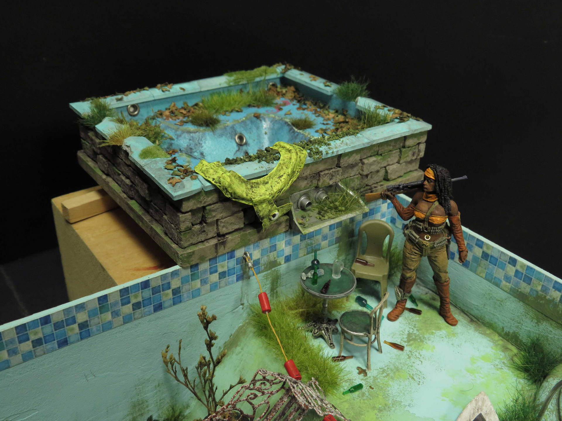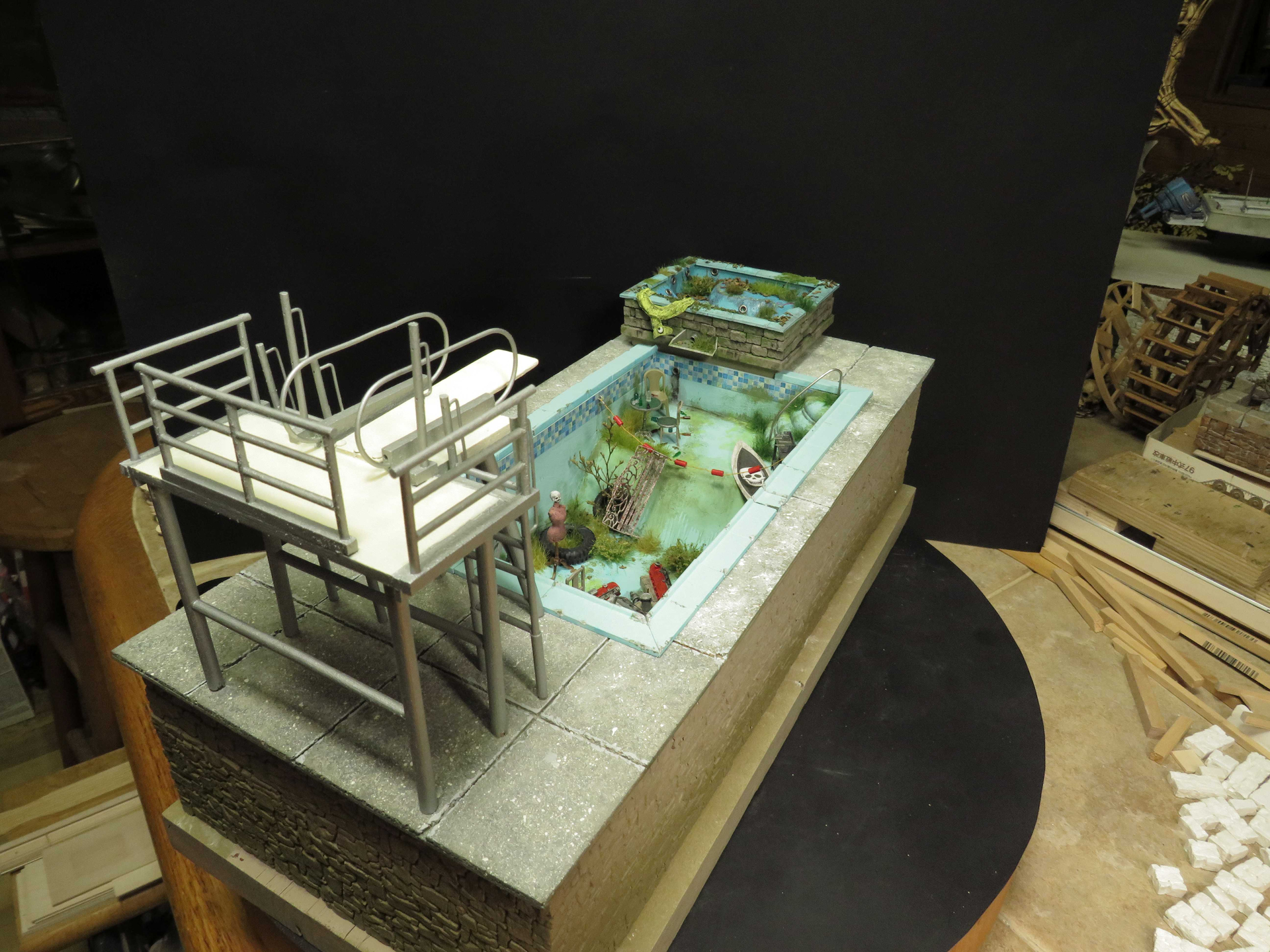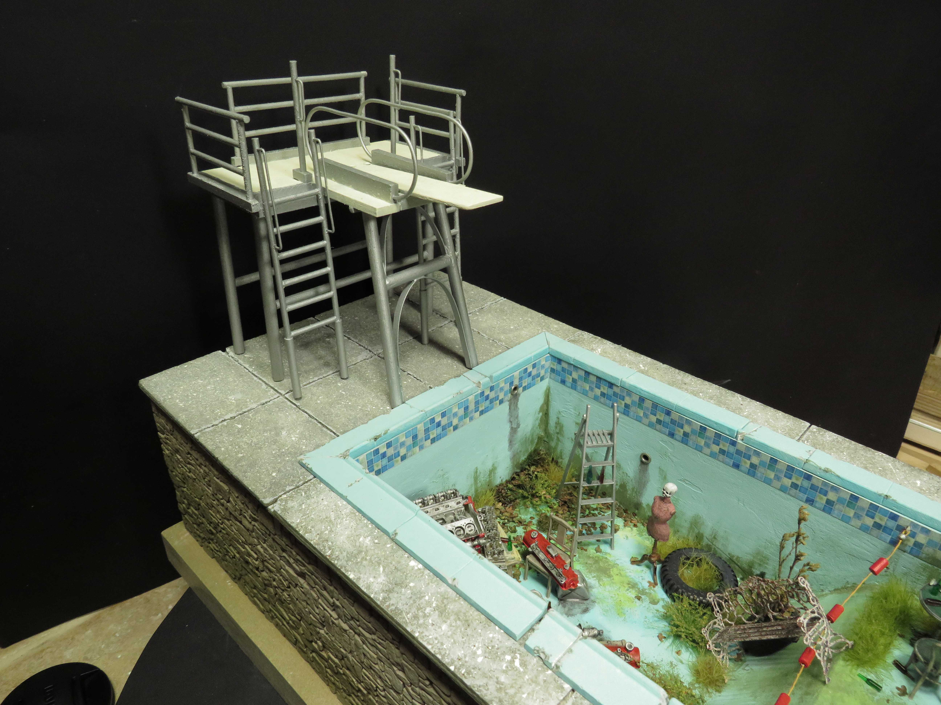 I was looking forward to seeing how you tackled this! The leaves, green scum and vegetation looks very cool against the blue and there is lots of bits and pieces long forgotten left there. Such great colors too- not just the pools but the junk and various other bits and bobs. Awesome stuff!