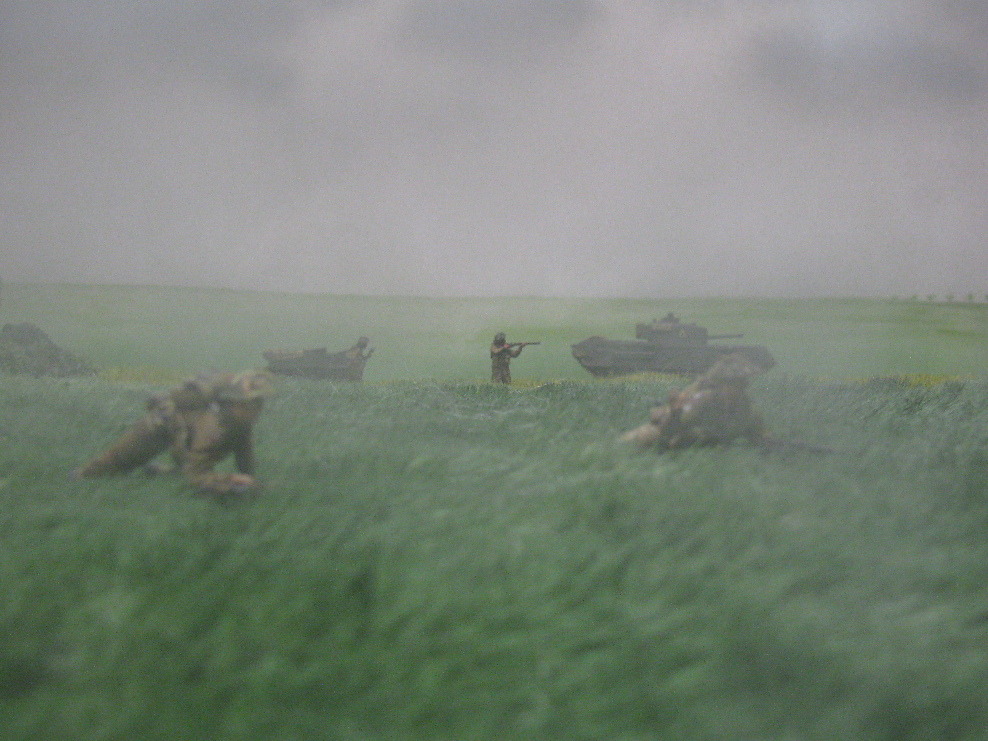 Up ahead, the Infantry, having begun to take fire from all directions, are guided on line by the surviving leaders. The shouted orders are never heard above the cacophony of small arms, artillery and mortar bursts and tank engines and main guns cracking at targets. So the leaders end up exposing themselves to enemy fire to place the troops in position physically. This results in high officer and NCO casualties.