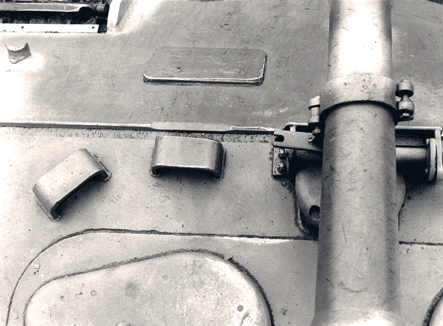 On the machine itself, the pilot’s hatch is blocked by a metal plate. Only one piece of the Bosch headlightbase remains . Note the weldings linking the glacisti the sides.
