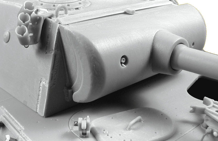 The gun shield.We can clearly see the shape of the .010" plasticard wedge fixed in the hole of the coaxial machine gun.
