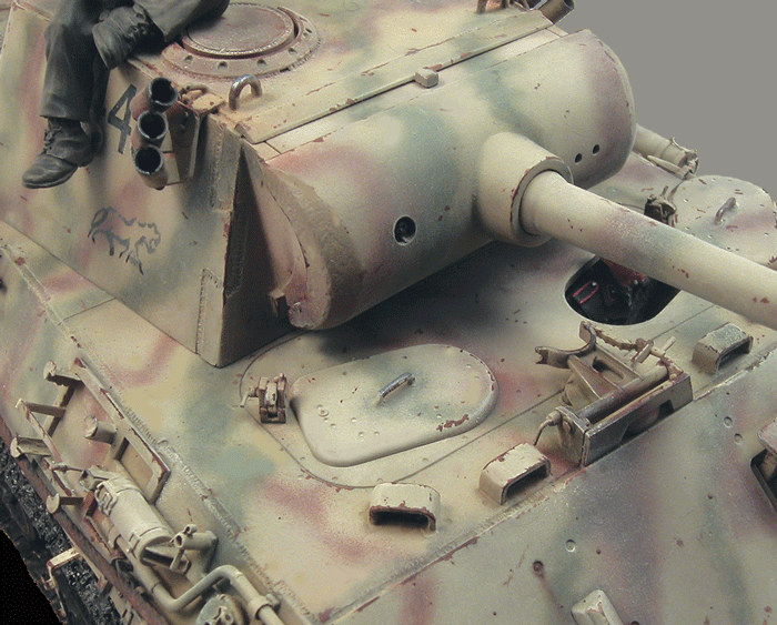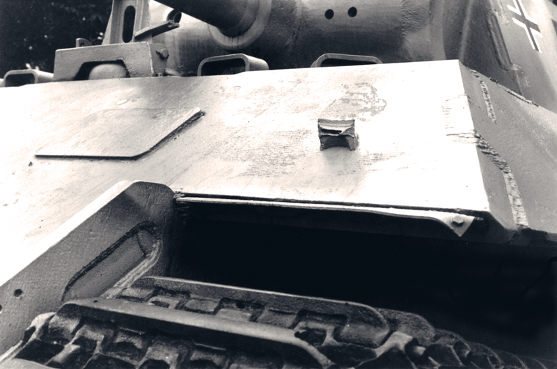 The driver’s and radio/gunner’s hatches with the protections of the episcops at the front.Later only one episcop will equip the G Panther,fixed for the gunner and rotative for the driver.The big clamping ring of the gun tube is in place.On the A type the radio/gunner’s hatche was replaced by a rotative mechanism placed under the casemate.