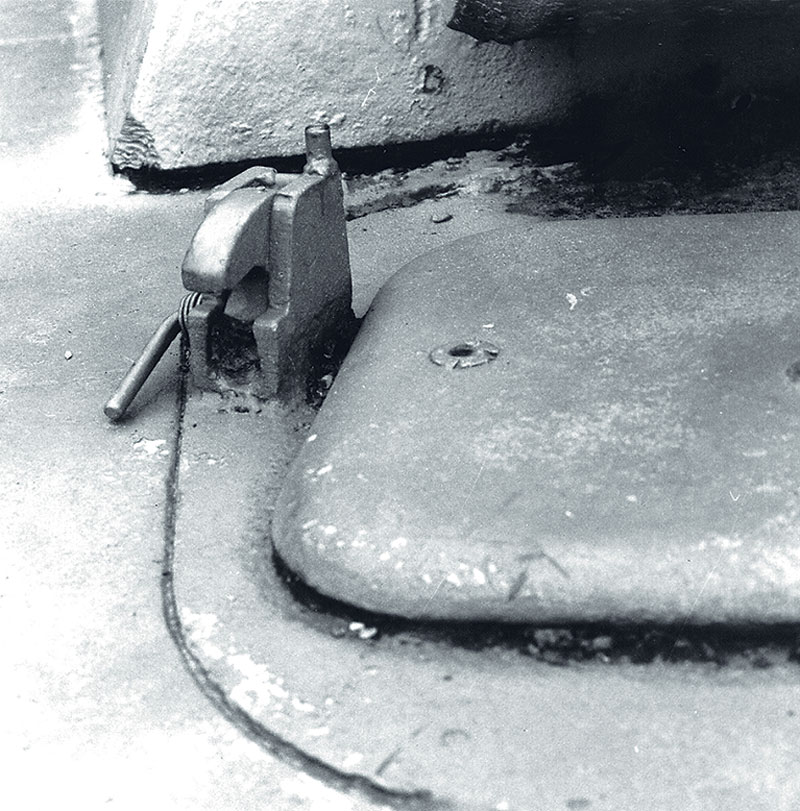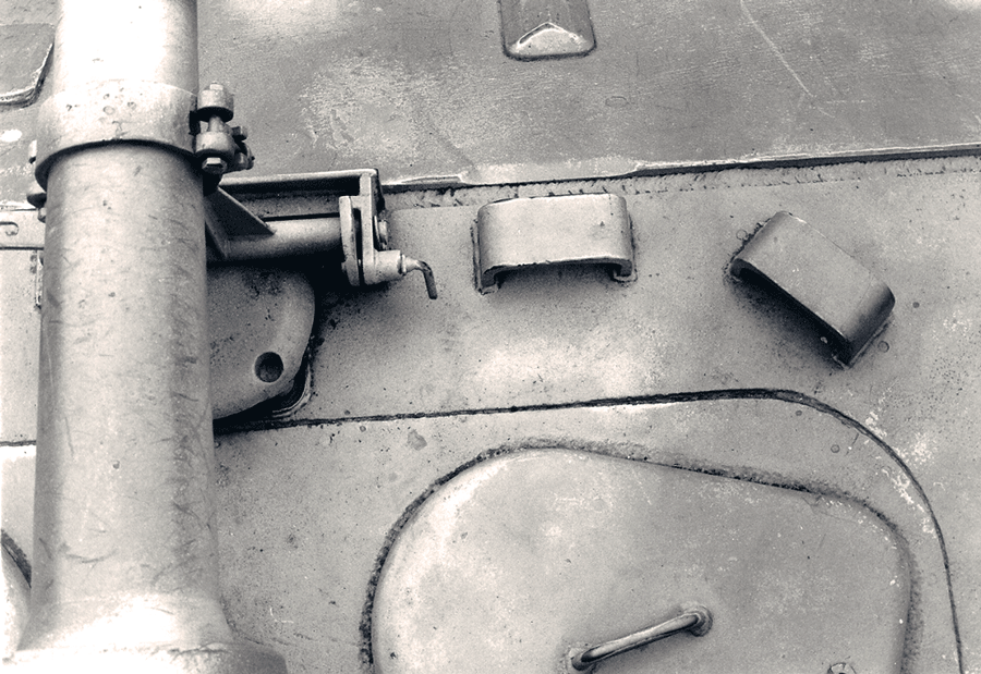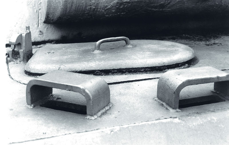 The cap of the hole for a close defence weapon is missing. It is protected by a gutter. When it was removed it was linked to the turret by a chain.
