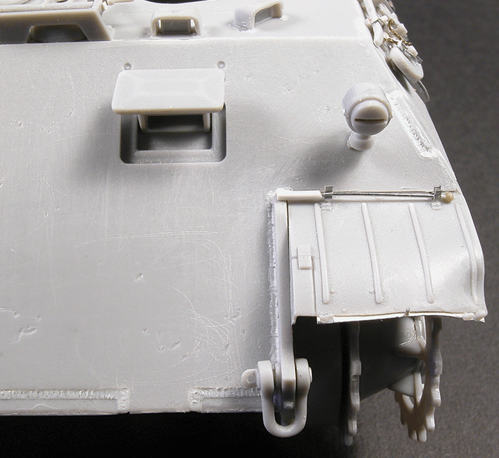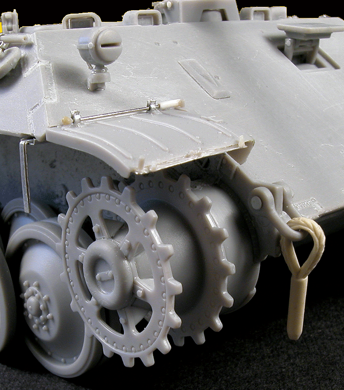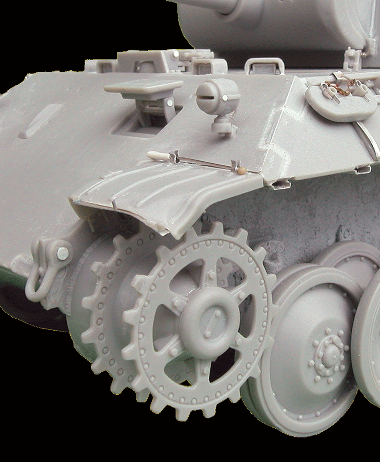 As we chose to realise an early version of the D Panther we equpped the model white the gunner’s protection cover-part J25- and white both Bosch headlights.The driver’s hatch is open.Glue two plasticard discs to simulate the ends of the axle.Wen they are not used the manoeuvring guides are fixedon the mudguard with some clips.These aluminium are shaped on a swing needle. The rod is in wire,its base is cut in some sheath for telephone wire and the ball is in Magic Sculp.The Bosch headlights are very nice. You only have to add thr rivets on the frame and the locking handle at the rear. We can clearly see the improvements brought on this part of the model.