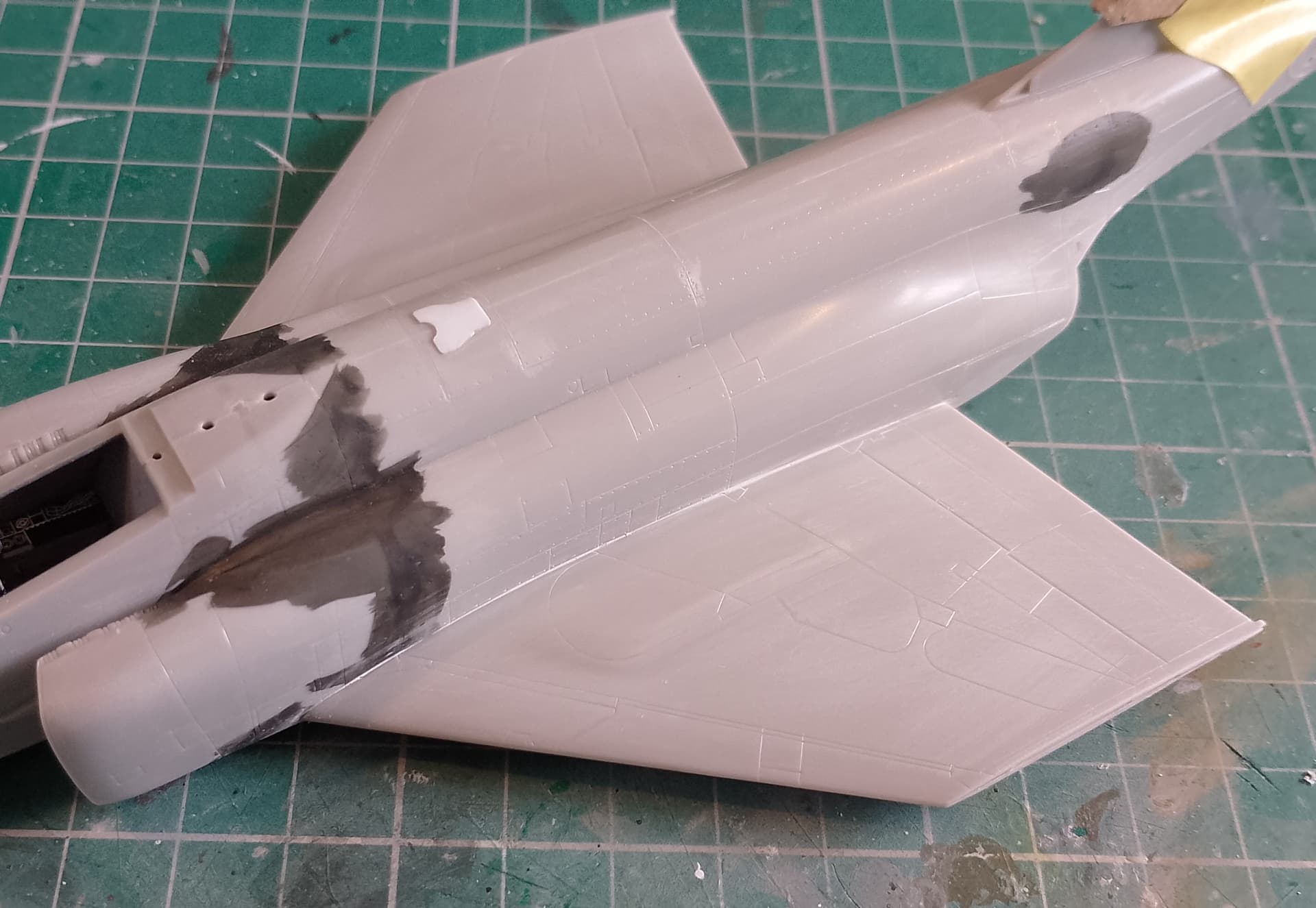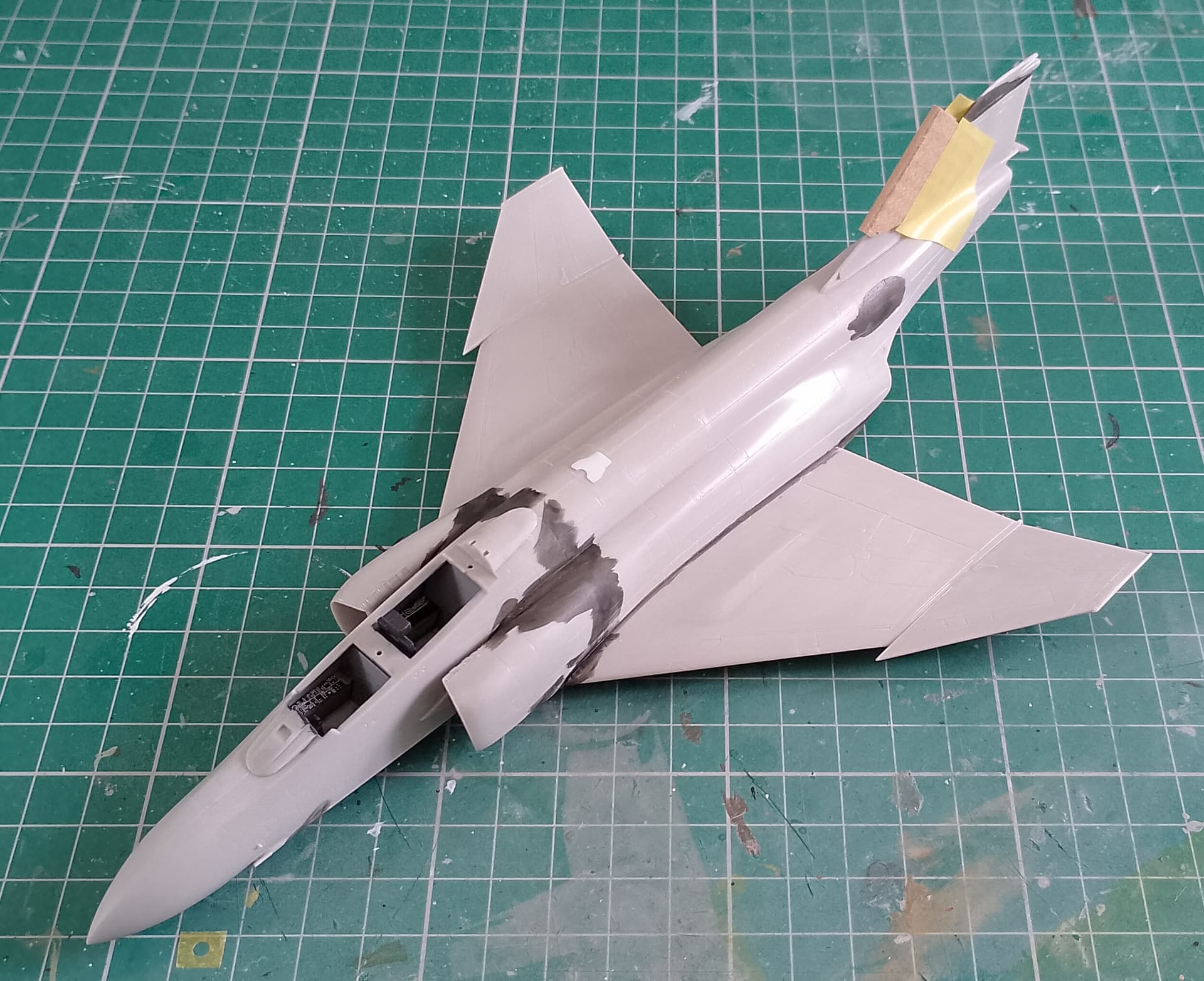 Nose, rear fuselage, belly and intakes fitted. Lot of parts that need careful lining up. Wasn’t 100% successful, but nothing a bit of filling and sanding can’t solve.