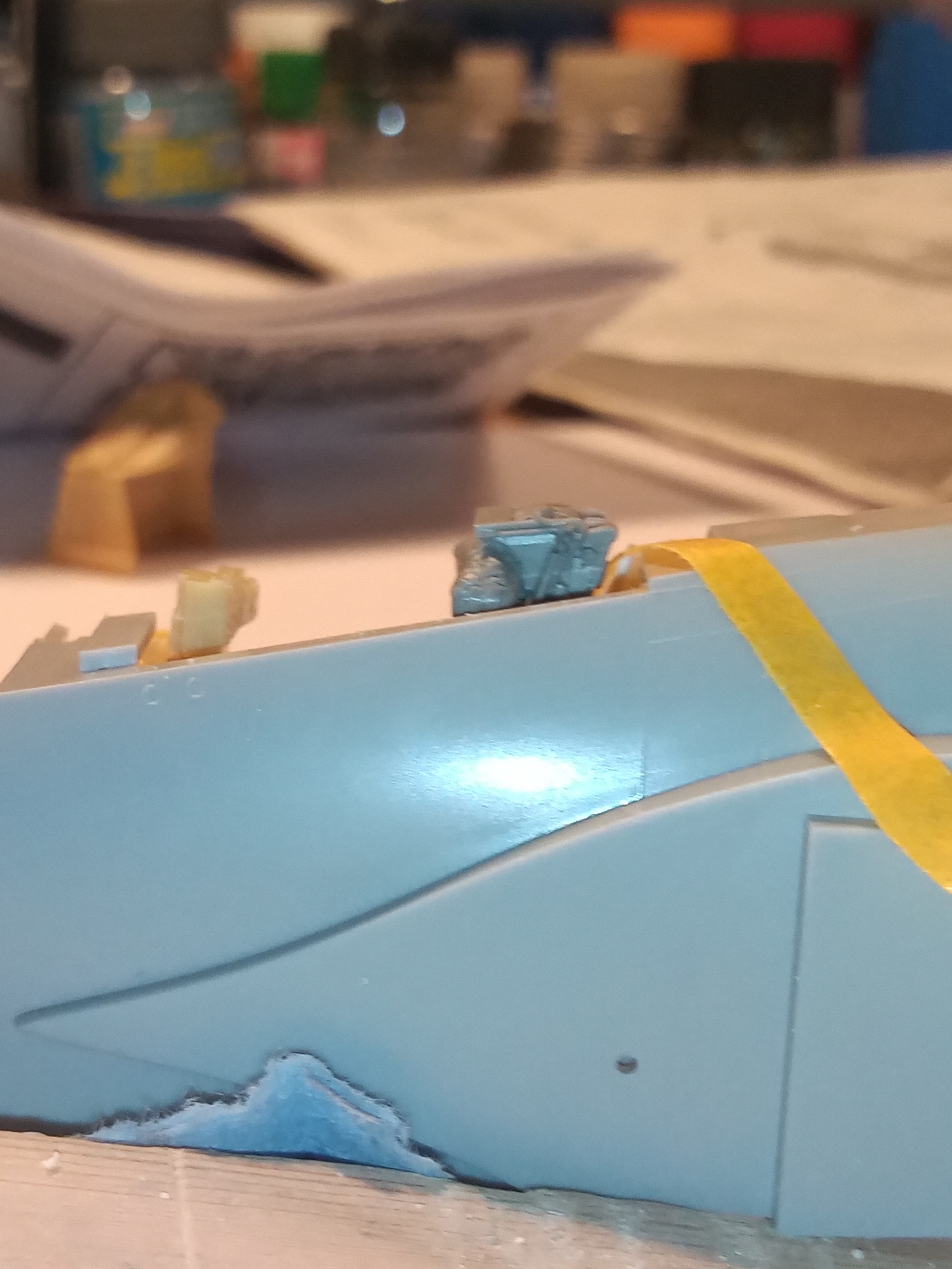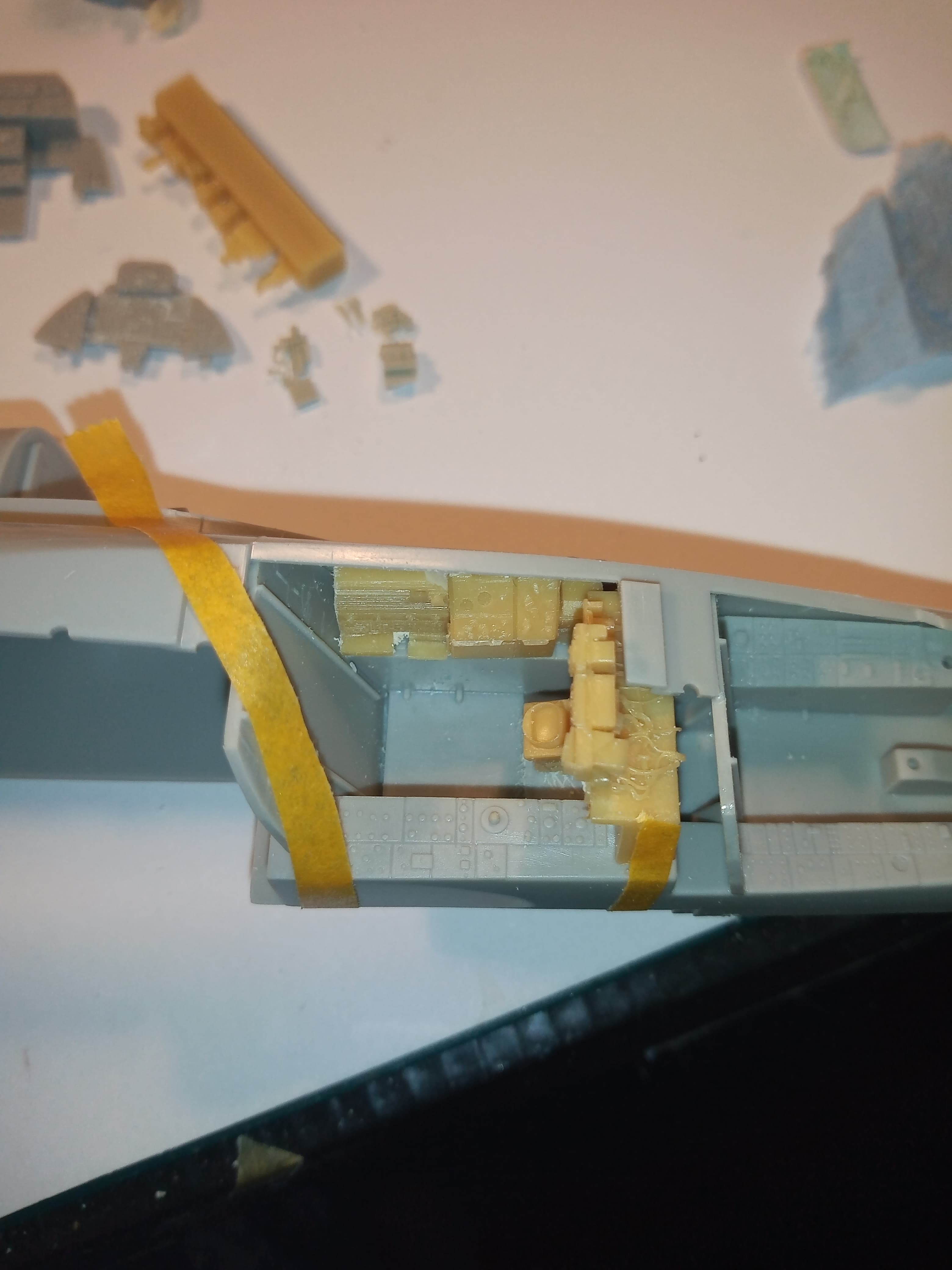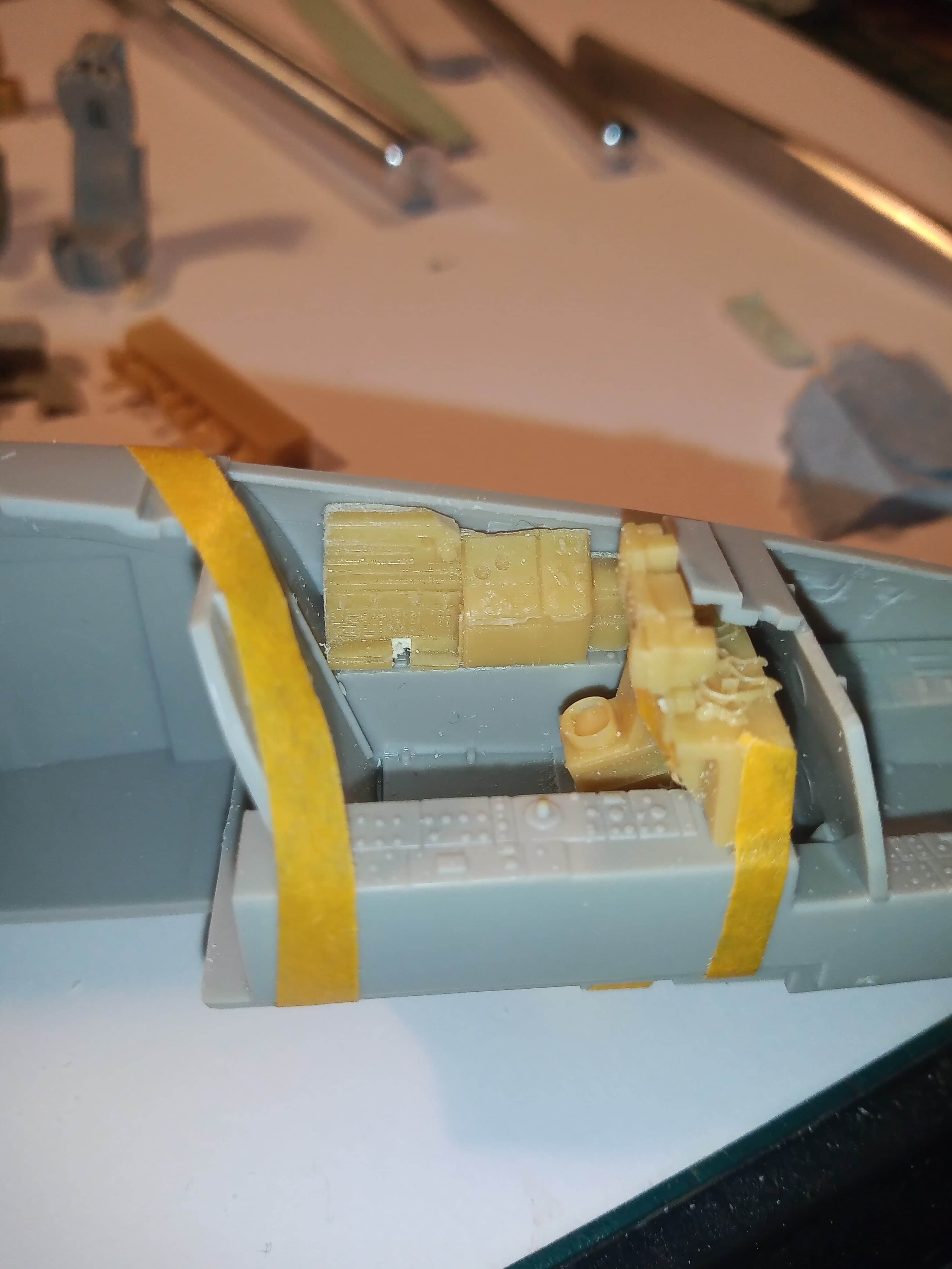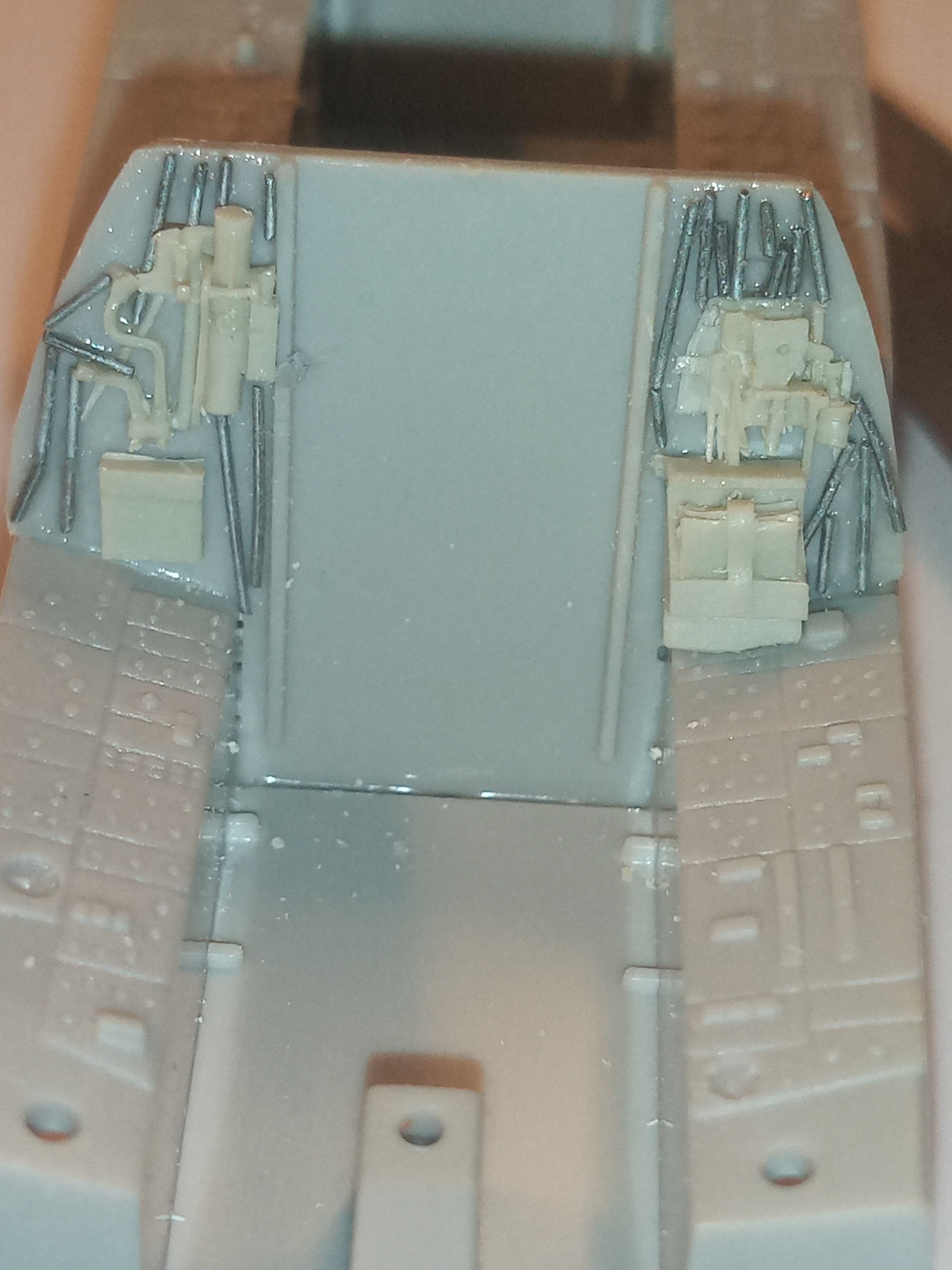 Started to add some details to the rear bulkheads. Used some of the resin sliced from the Aires cockpit tub and glued back into the same place and some .5mm wire to show cables, not 100% accurate but enough to add some interest to those areas…