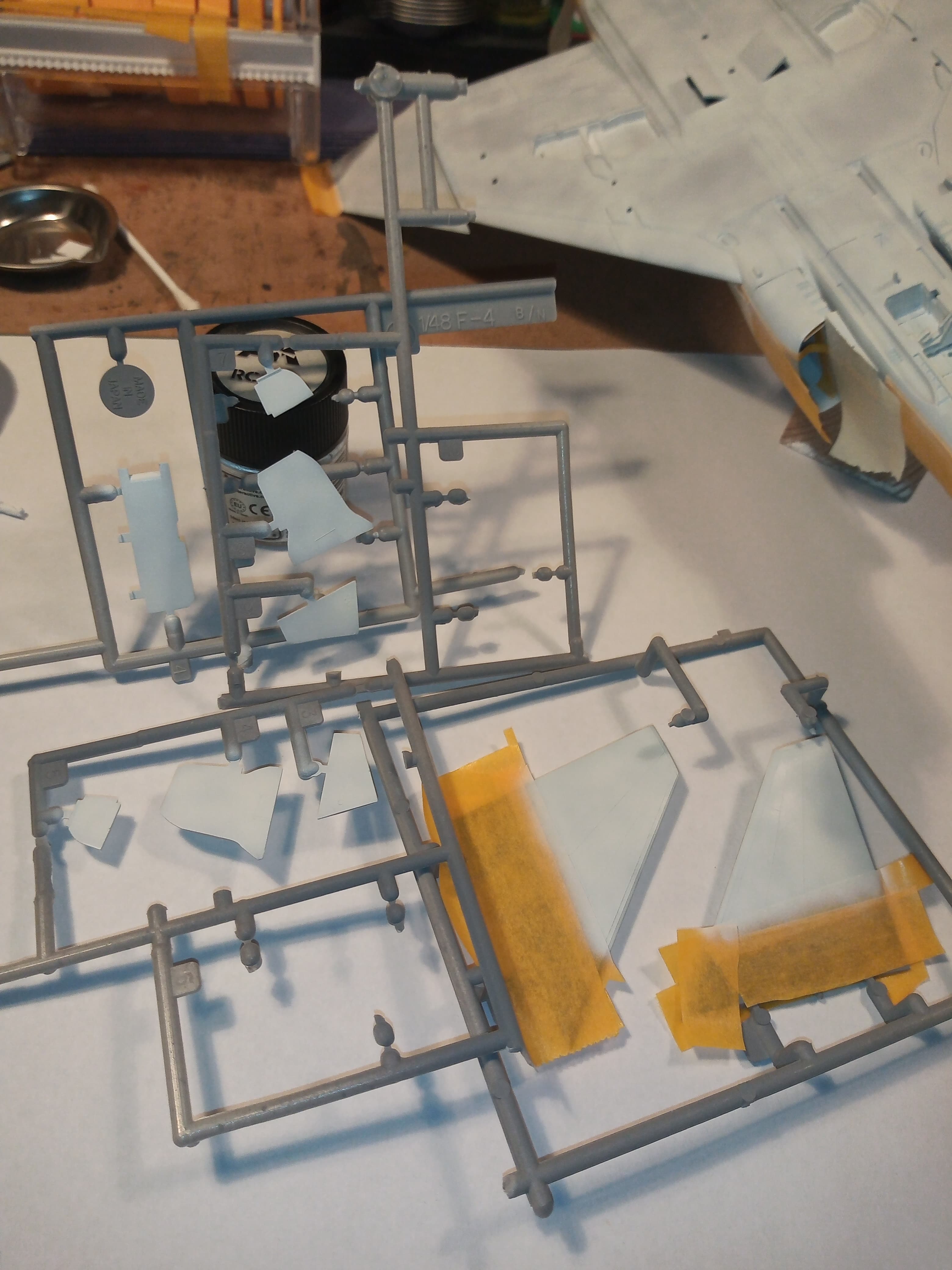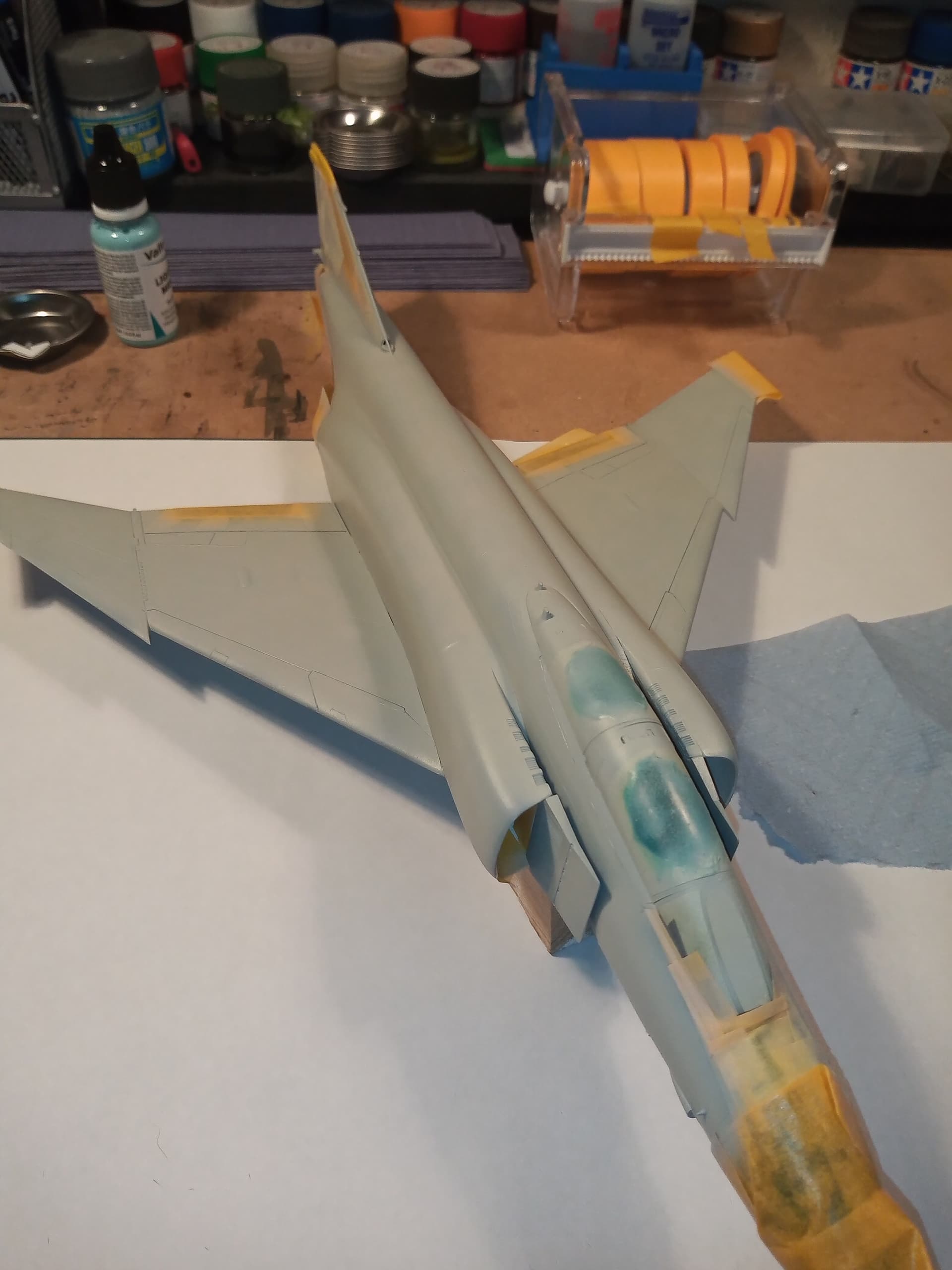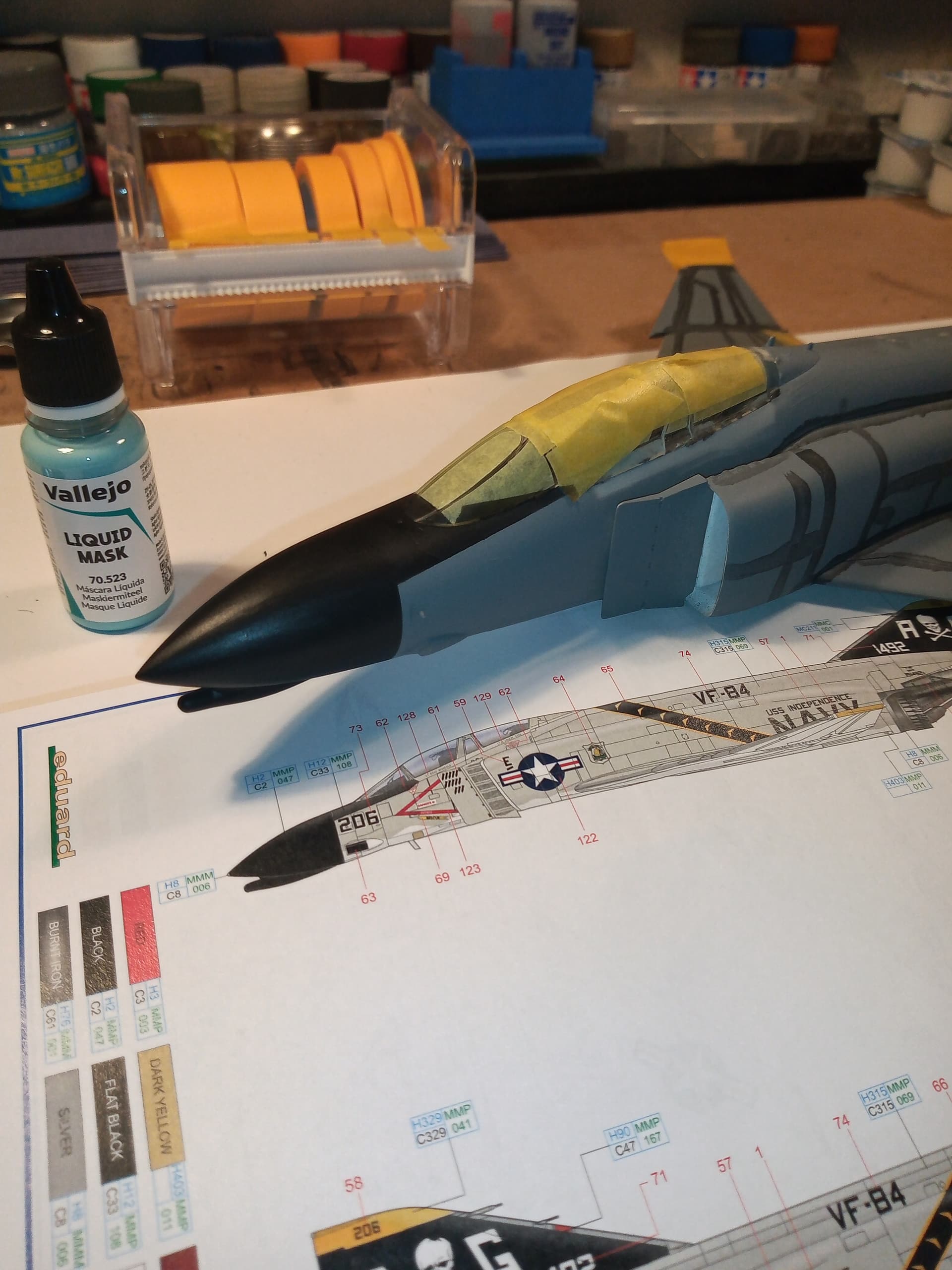 I got a lot of masking done, and sprayed the nose and the leading part up to the canopy in black.