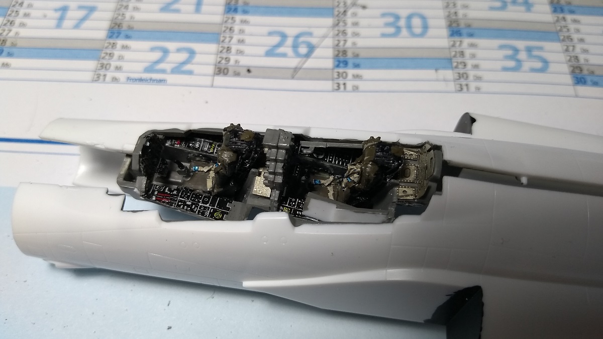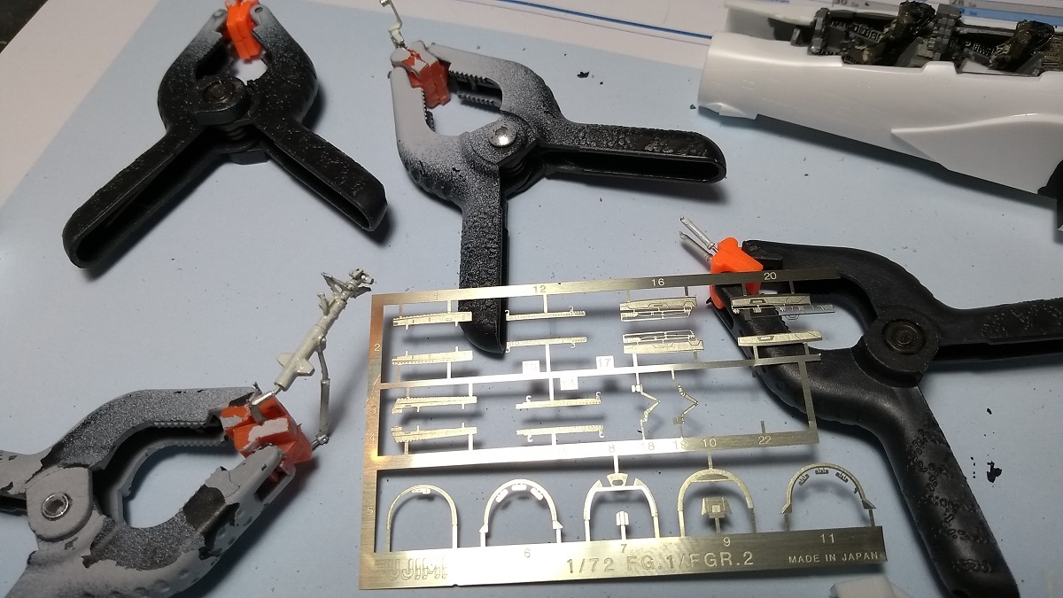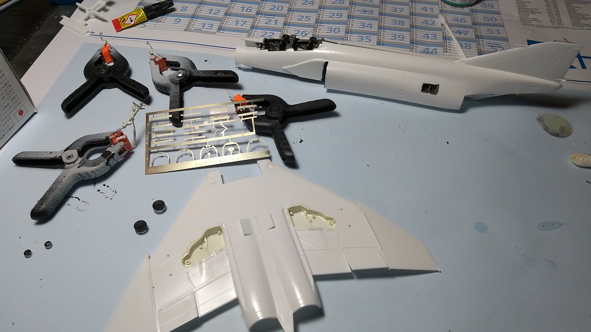The undercarriage is white-metal and looks great, the fitting of the parts is ok so far, as usual with these Fujimi Phantoms, the painting will be the major challenge here…later