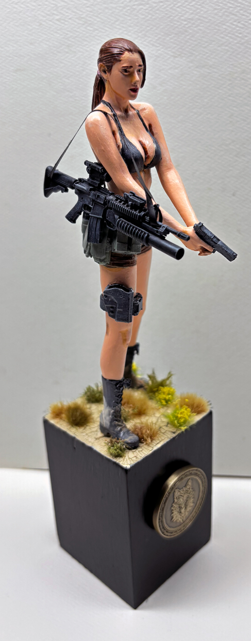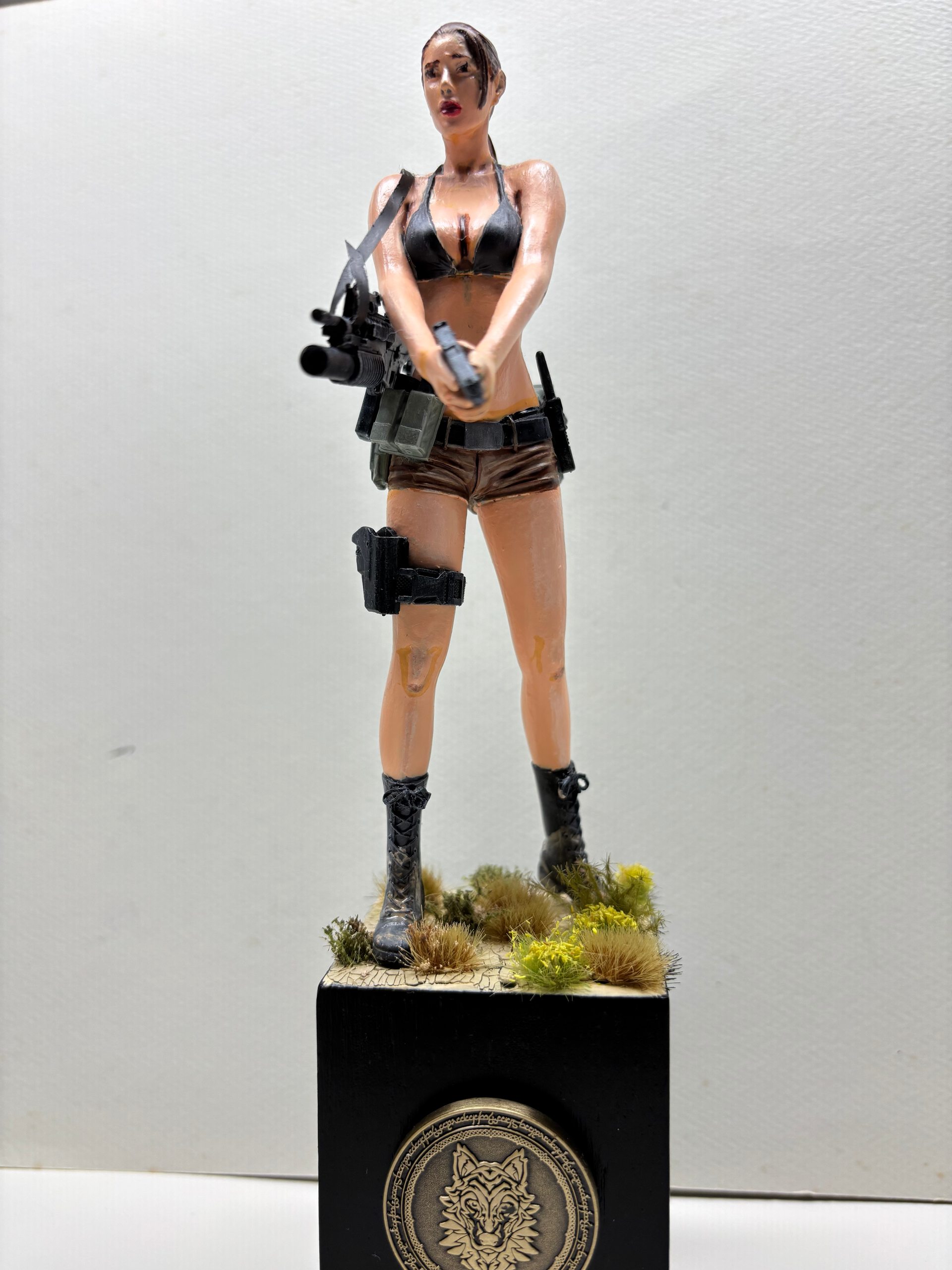 The thigh holster is 1/12 from ETSY, 3D printed resin with a flexible strap, and the radio is also 1/12 from ETSY. Lara Croft is only known for carrying two handguns.