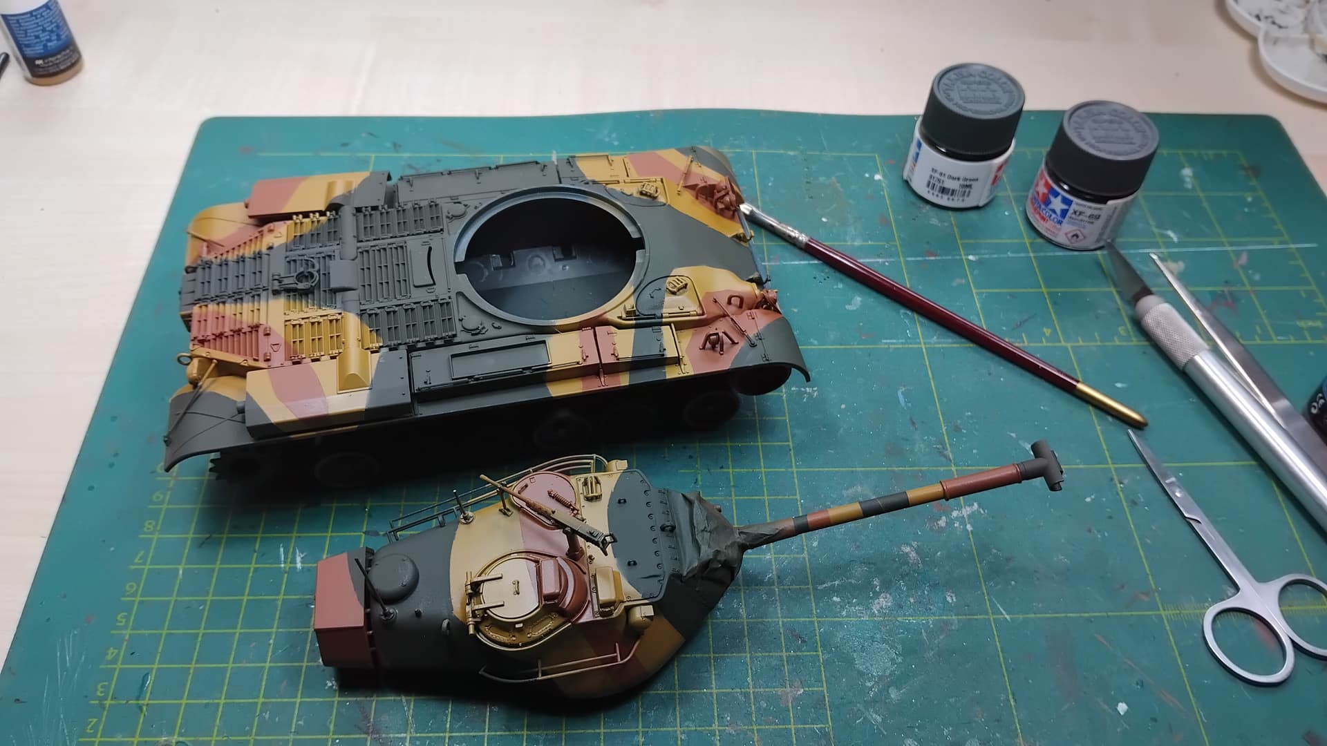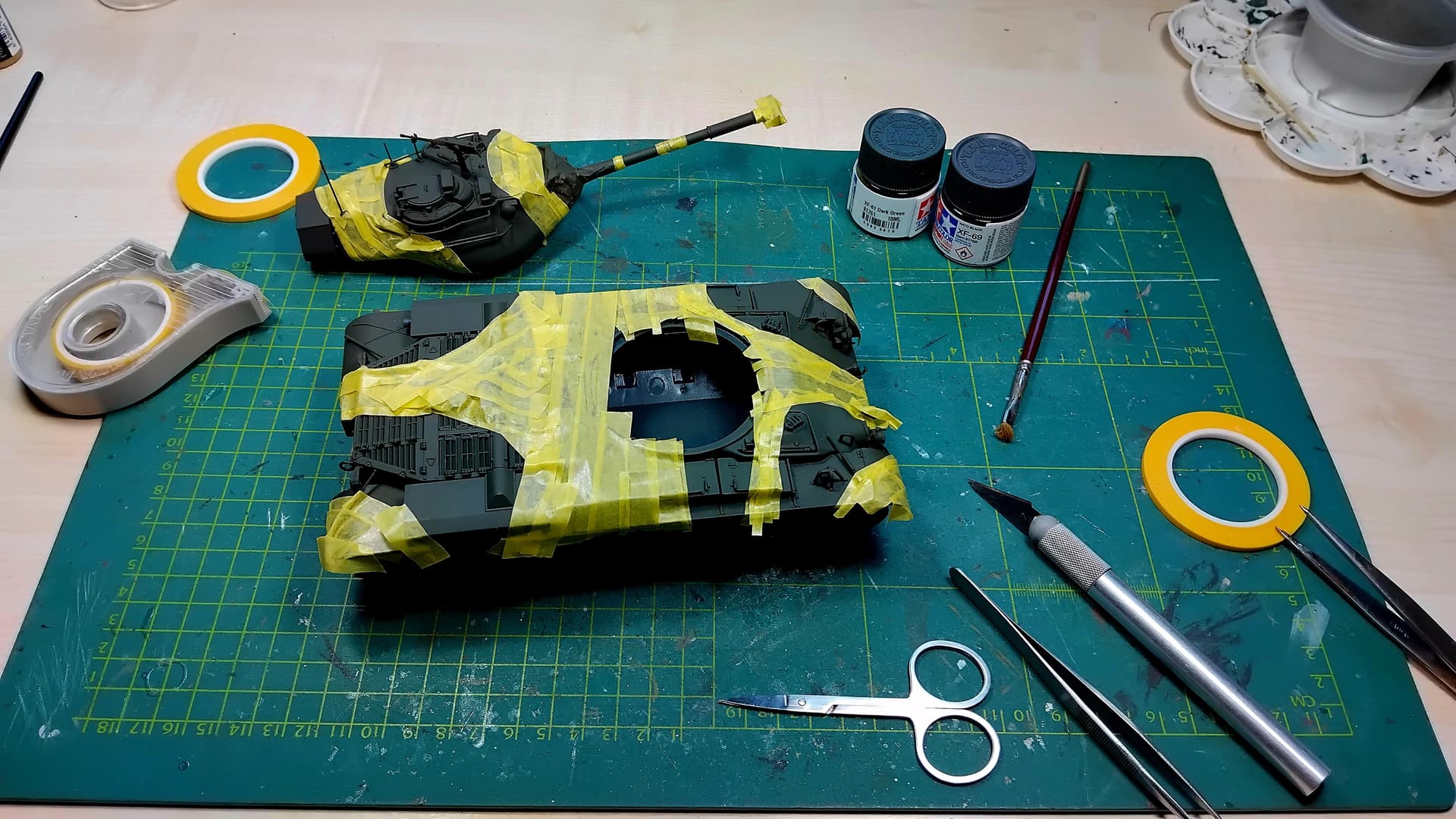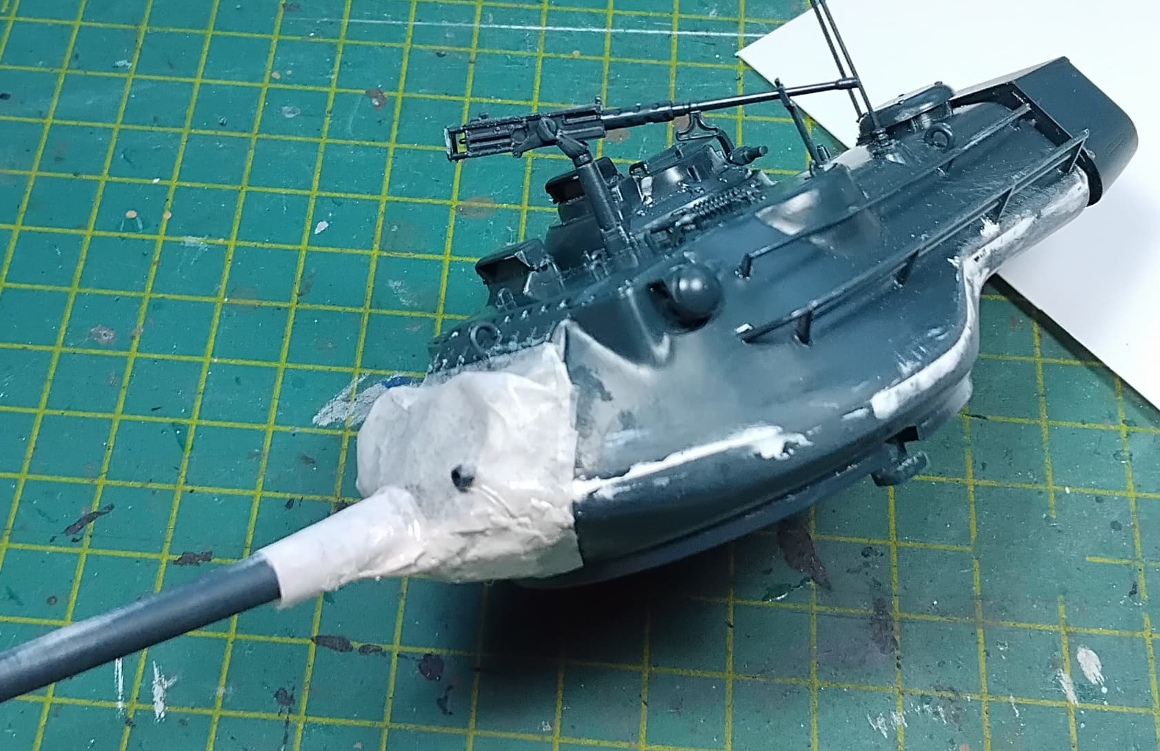 However… there is an issue with the green that was on the hull bottom; the Tamiya paint came off with the tape. But since it is all pretty straight I hope fixing the issue will be relatively easy.