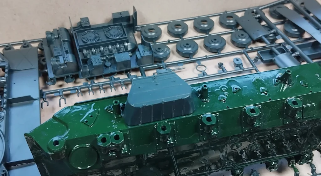 Then there’s the thing with the tracks; they are tick, stiff and very tight! that causes a issue when putting them on when the hull halves are joined, since there is very little room left.