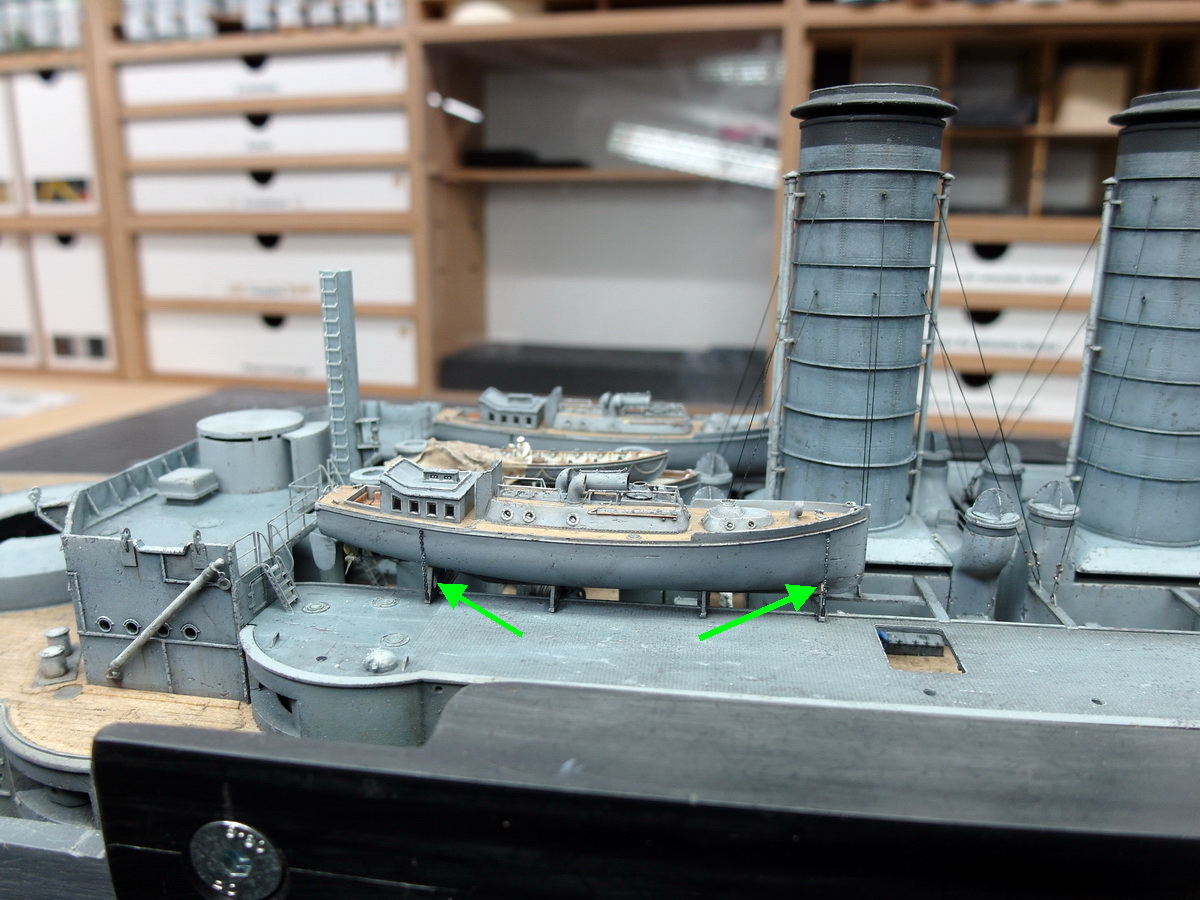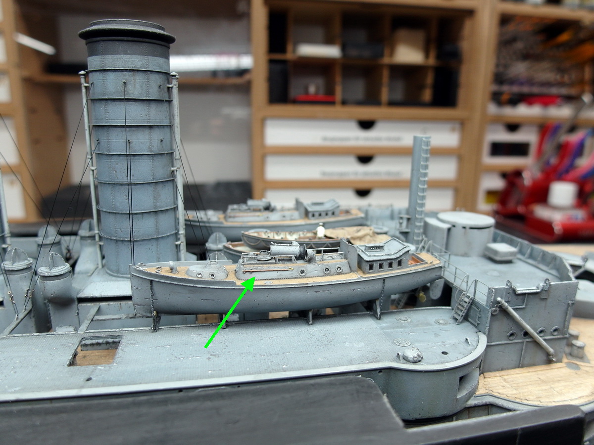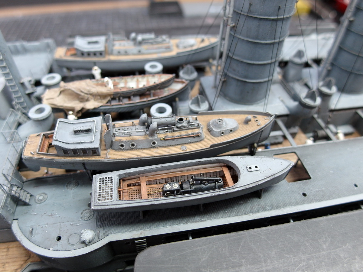 I need to refinish the deck where the pinnaces rest. During all the adjustments, I scratched the paint surface and had to patch it up. I’ll have to go back to that.