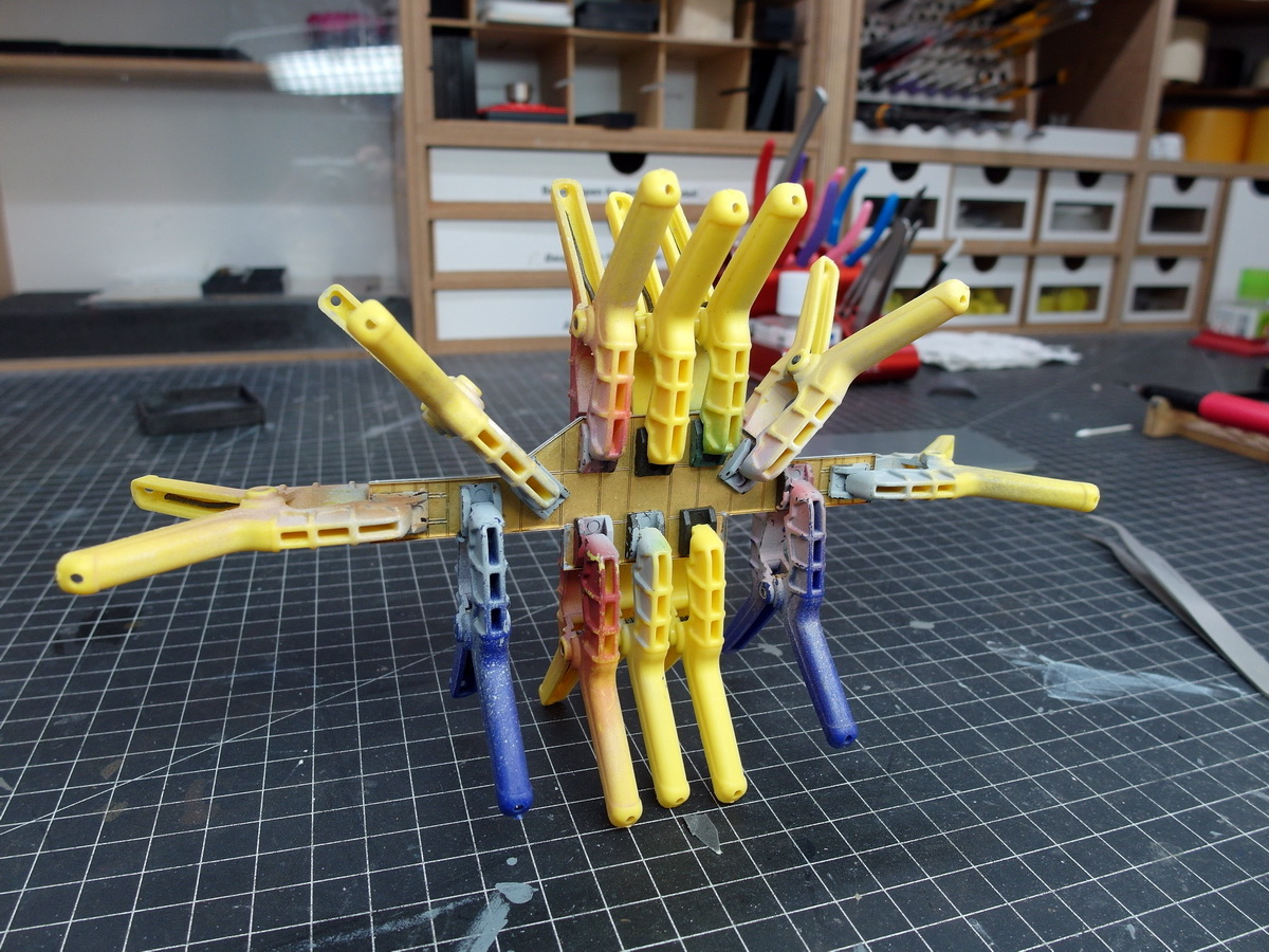 First, I cut stanchions into small pieces. The green arrow points to pre-cut stanchions in a scale of 1:200. I want to use them as rope tensioners. The yellow arrow shows some in a scale of 1:350. They’ll serve as eyelets on the funnel.