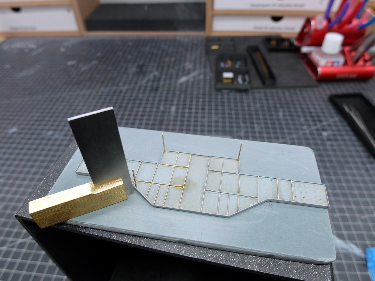 After everything had thoroughly dried, I wanted to attach the posts that support the bridge on the bridge house. They were originally made of plastic, but I immediately rejected that idea. I cut some out of brass to give them more stability.