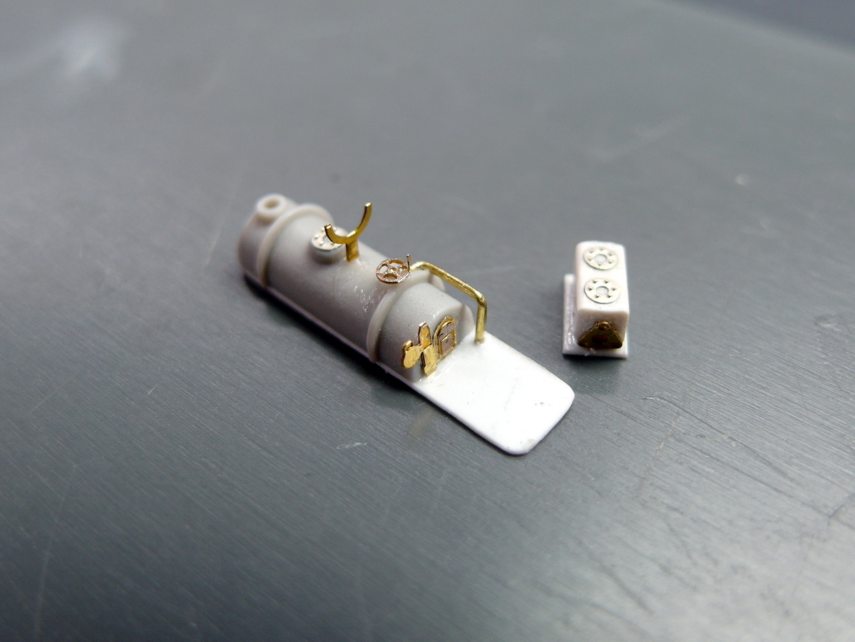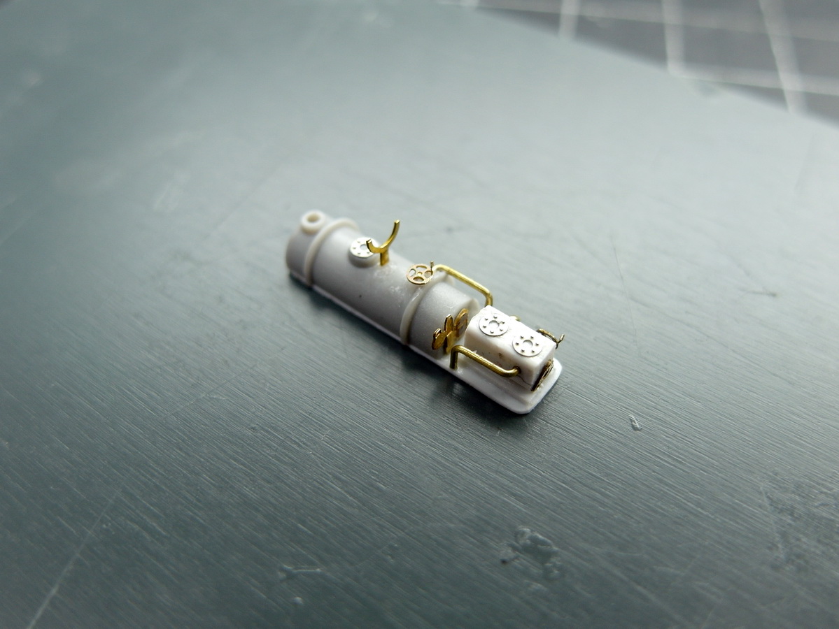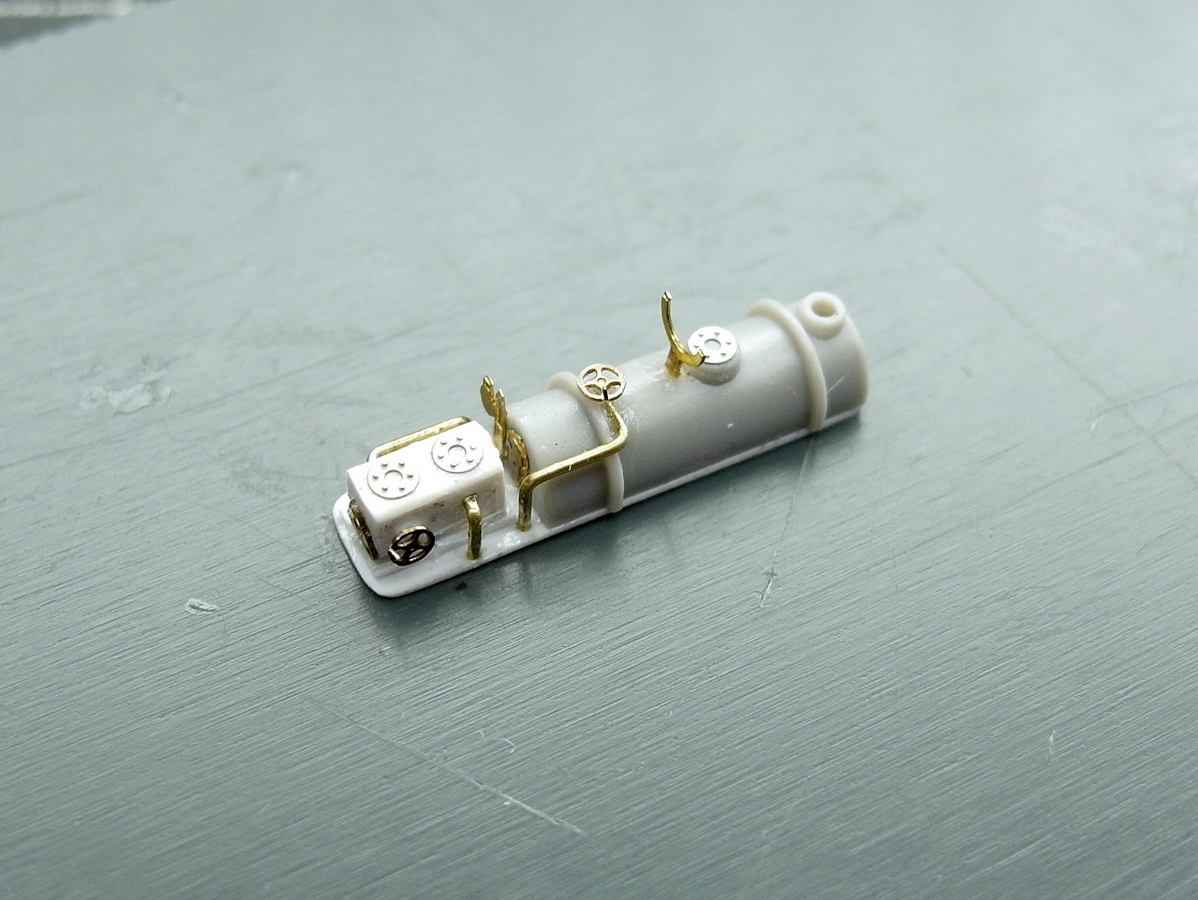 Then, little by little, more details were added: piping, a handwheel, and a support for the tilting funnel. A small instrument panel at the front rounds it all off. Everything is then mounted on a styrene strip for easier handling.