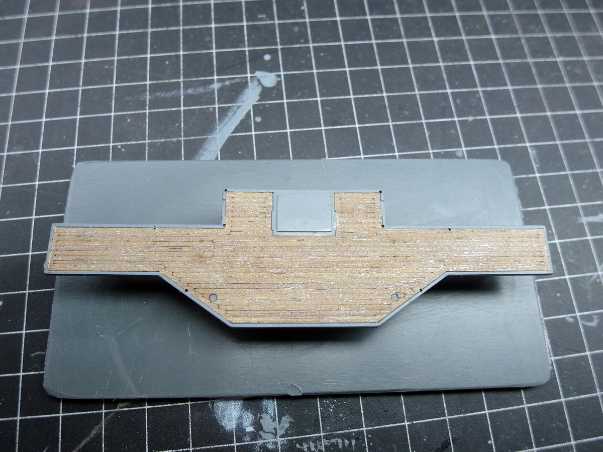 Then I inserted a grating floor. The Bismarck’s former bridge wing was trimmed and fitted. Cheers to the etched parts grab bag. And I removed the suggested grating at the rear.