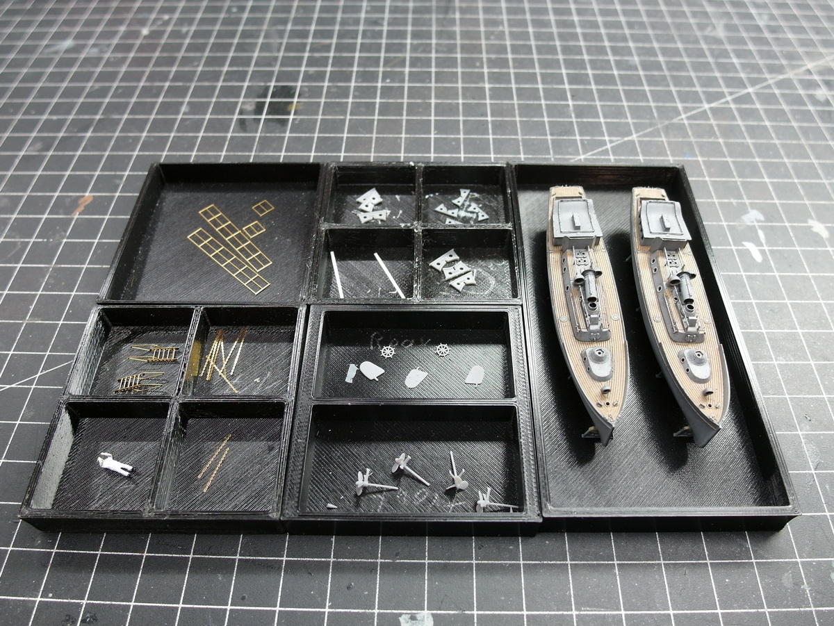 I pushed the next cutters back for now, as the davits are missing and I can’t determine the optimal position. The steamboat isn’t glued down yet either.