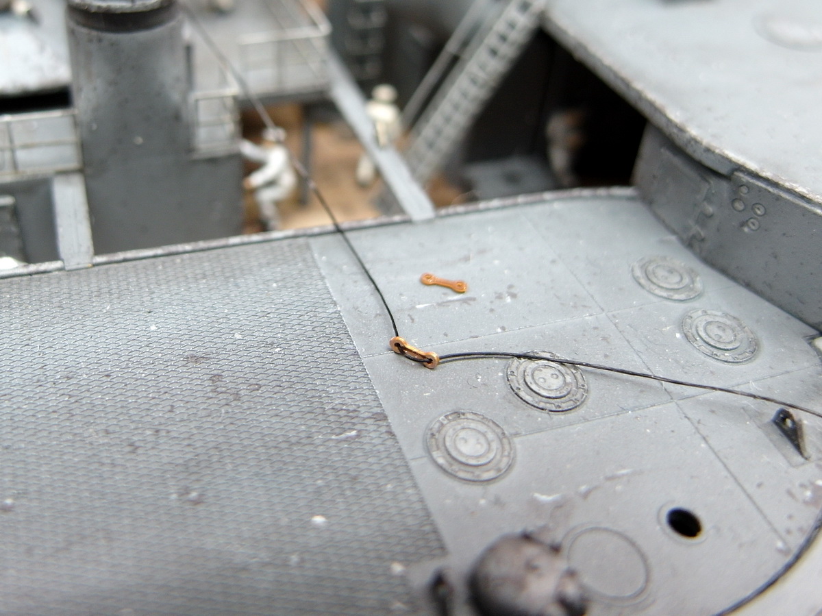 The first piece of rigging on the funnel is finished. Painted with aluminum paint, the thread running along the outside of the rope tensioner is almost invisible.