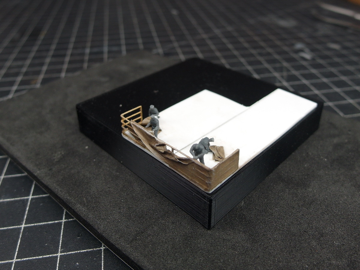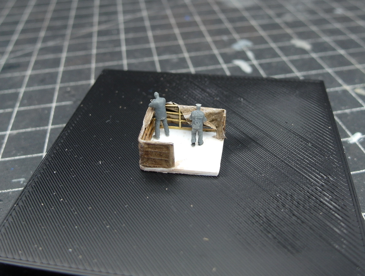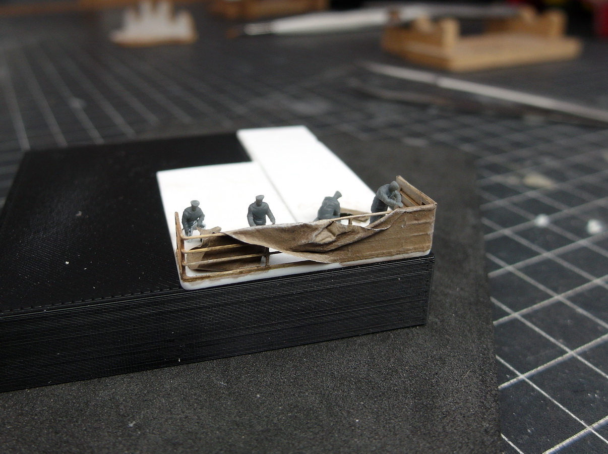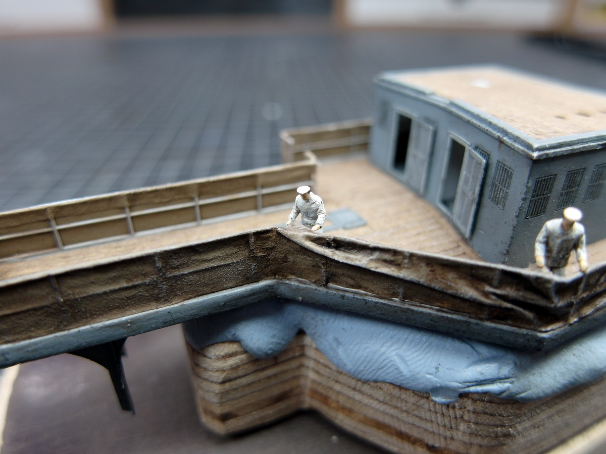 Once that was done, I looked at my work and thought, hmm, how could I make it a little more interesting? Maybe create a little scene where the crew is attaching the tarpaulin to the railing?
