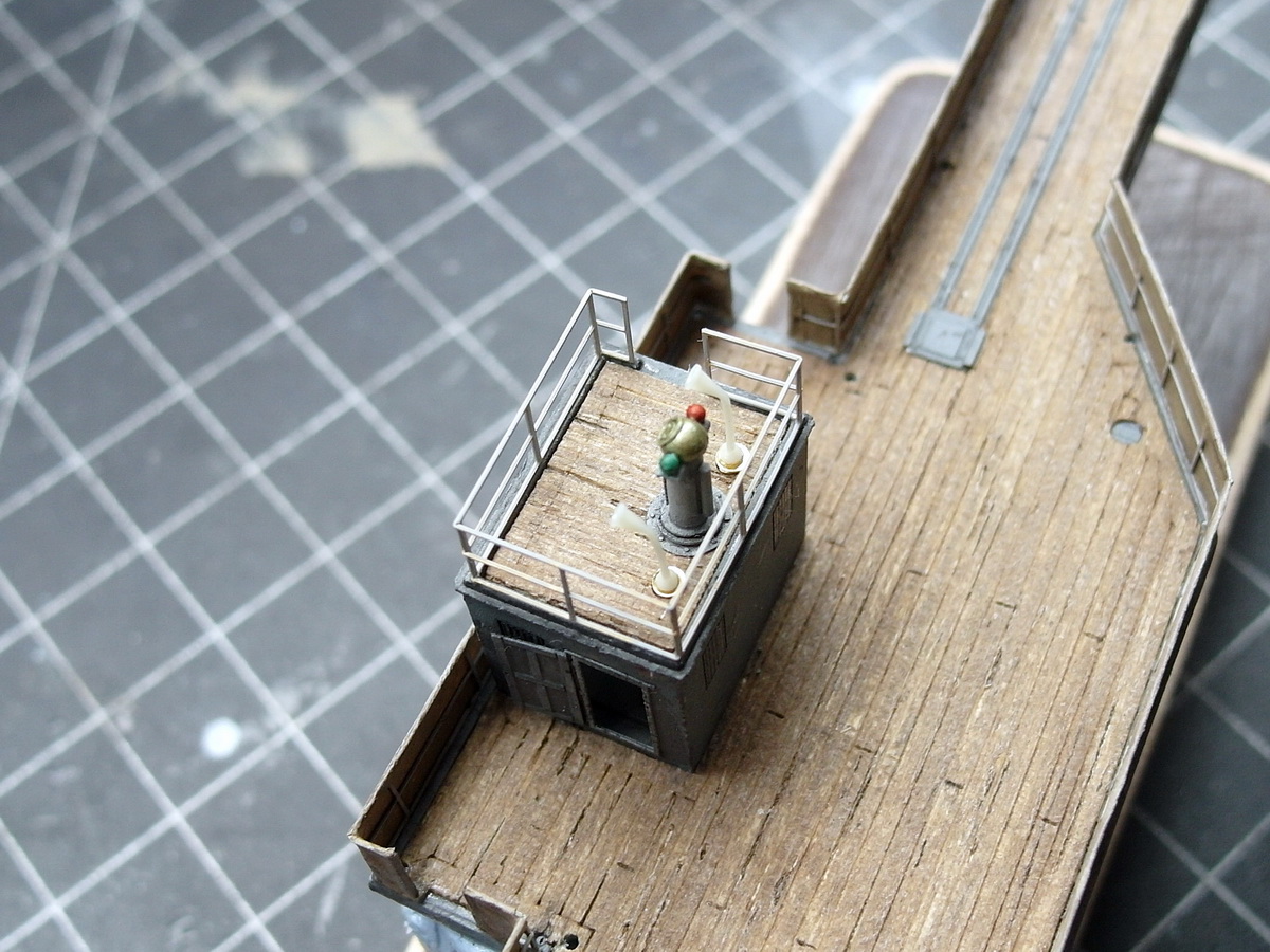 The height is currently flush with the railing. I think I’ll make it a bit higher, though. I’ll also make the signal flags out of tissue paper and put them on the shelf.