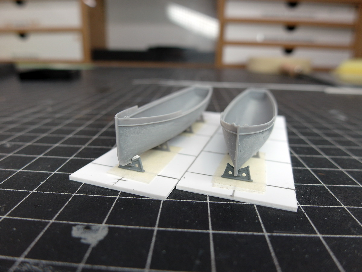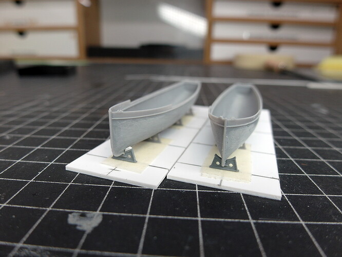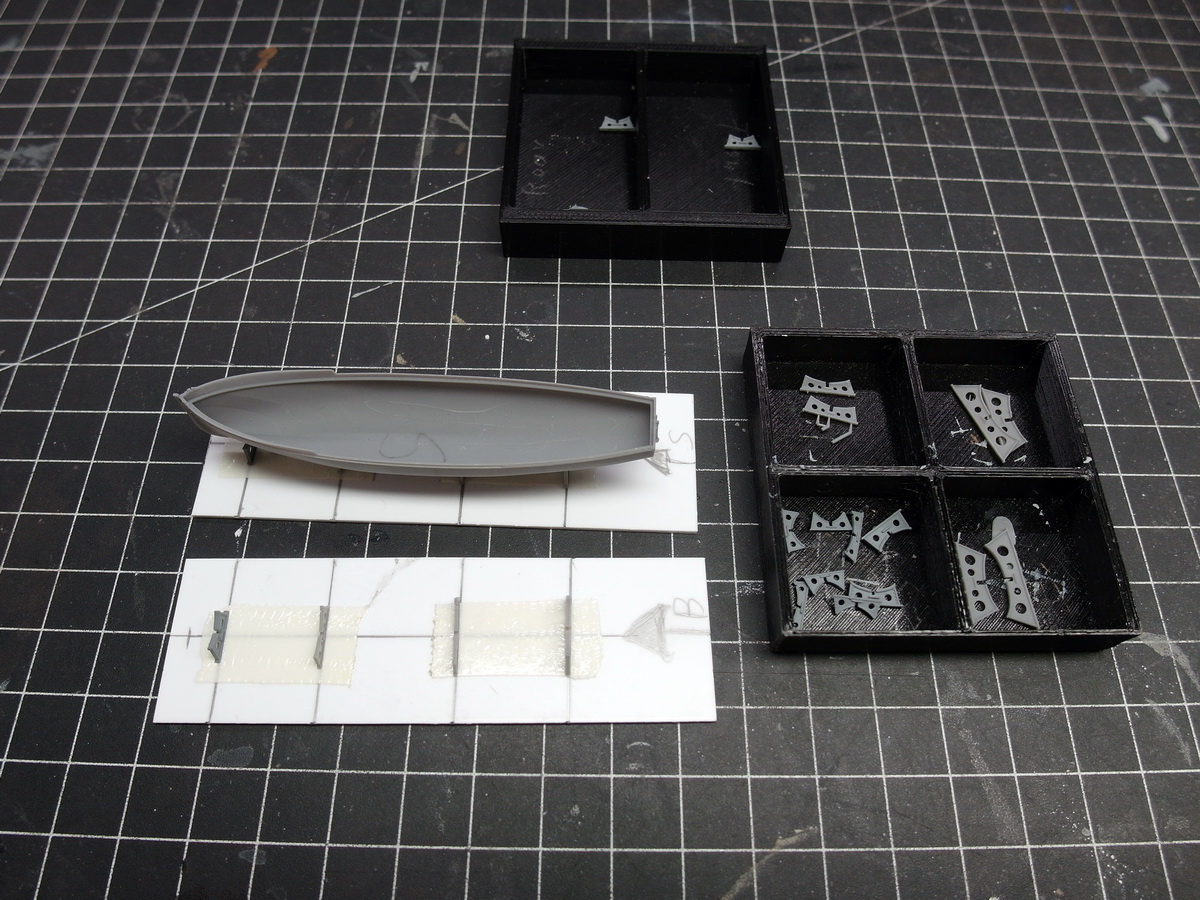 They don’t fit where they were originally printed. And besides, only three were planned. But the pinnace rests on four struts, so I need one more cradle. It’s nice that four boats will be hanging from the davits at the stern later, so I can repurpose the cradles.