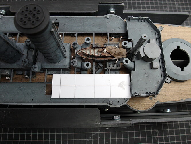 In my opinion, these can only be the gratings of the accommodation ladder. Since I will be showing my ship at full speed, as usual, they will also have to be stowed there on this model. But that will only happen after I have attached the bridgehouses to the deck.