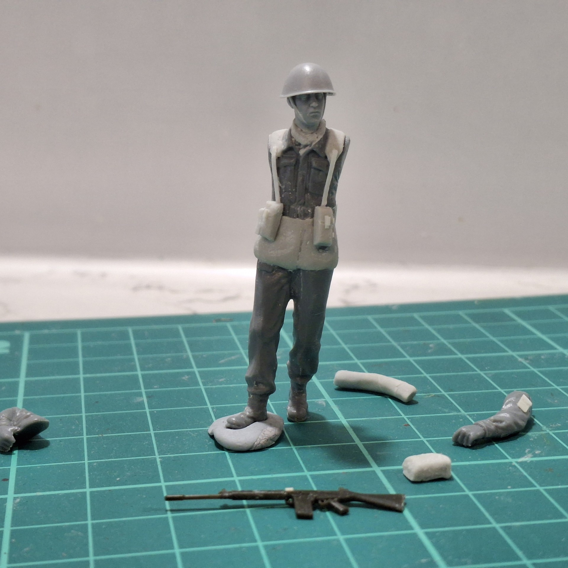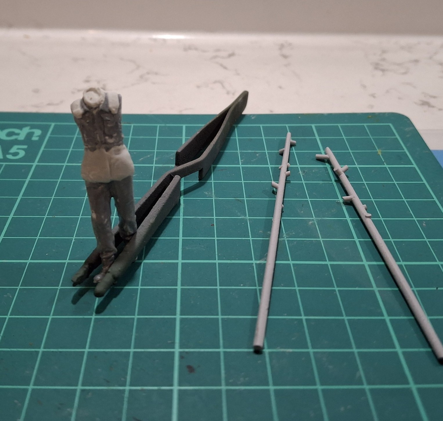 Then some mods to the figure itself - jacket skirts, and the beginning of the yoke of the ‘58 pattern webbing; also 2 x scrim poles sprayed with some texture paint to help replicate the fir/pine saplings we used: