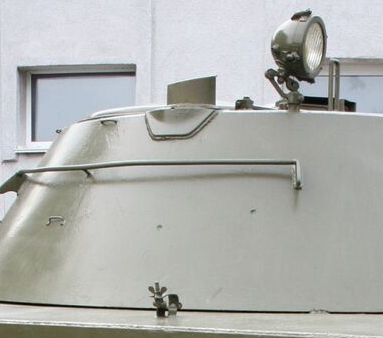 Because of the installation of an auxiliary hydraulic drive tank for the stabilizer in the front‑right section of the turret, the mounting of the rotating headlight was relocated from the turret roof to its right side.