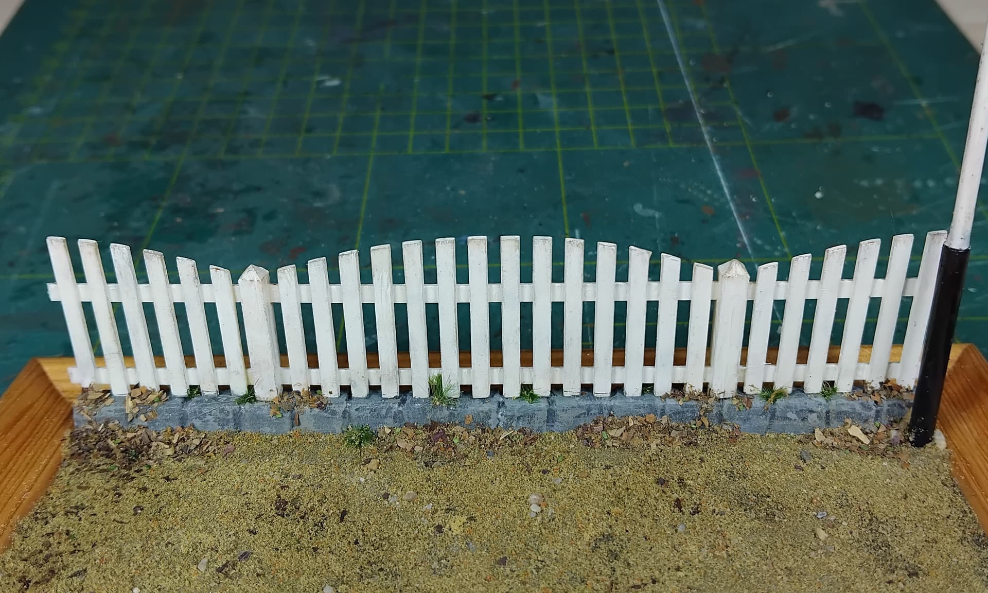 As said I had a bunch of items that were at least 25 years old, that I wanted to look at and this is what I came up with: the fence and roadsign from Tamiya’s set, painted and weathered, using pictures from late 1930’s rural Germany. The roads were remarkably flat and well kept in those days, so I replicated that.