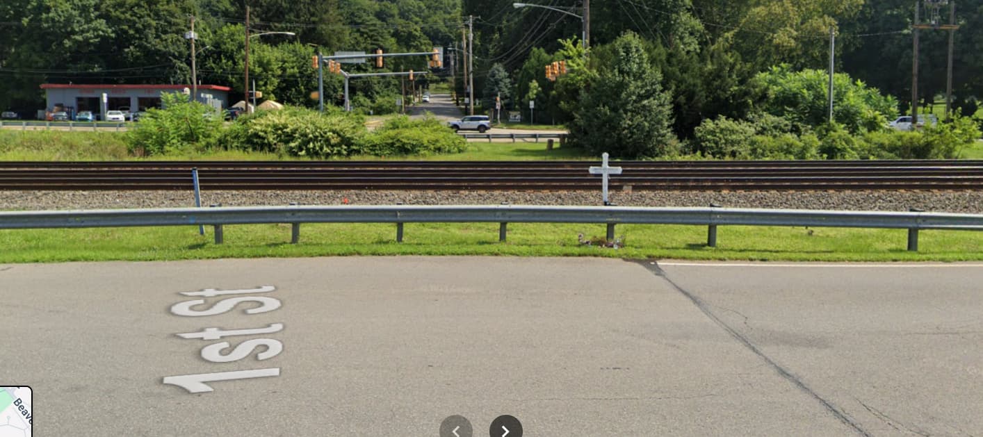 The road used to cross the tracks and continue to the street beyond. Note the memorial to one of several people killed there. (BTW, if you go off the designated road and walkways at crossings the railroads - and the law - considers you to be âtrespassersâ with very little liability on the railroadâs part. They even file the accident reports as âtrespassersâ, not pedestrians, killed and injured.) There was one wreck where a drunk idiot was crossing from this side to the farside and decided to play matador with an oncoming train. The engineer dumped the brakes and it stopped so quickly that the consist of empty hopper cars derailed.