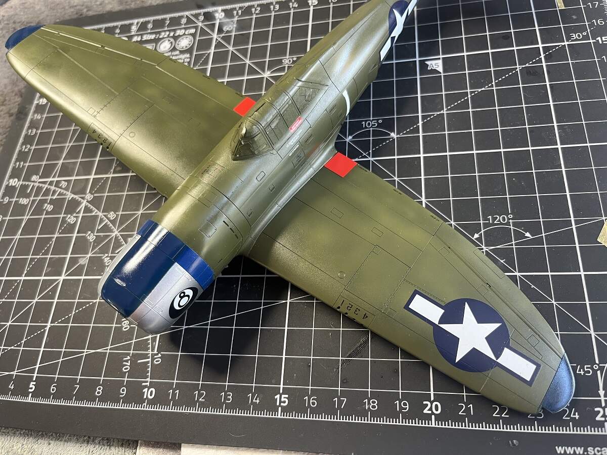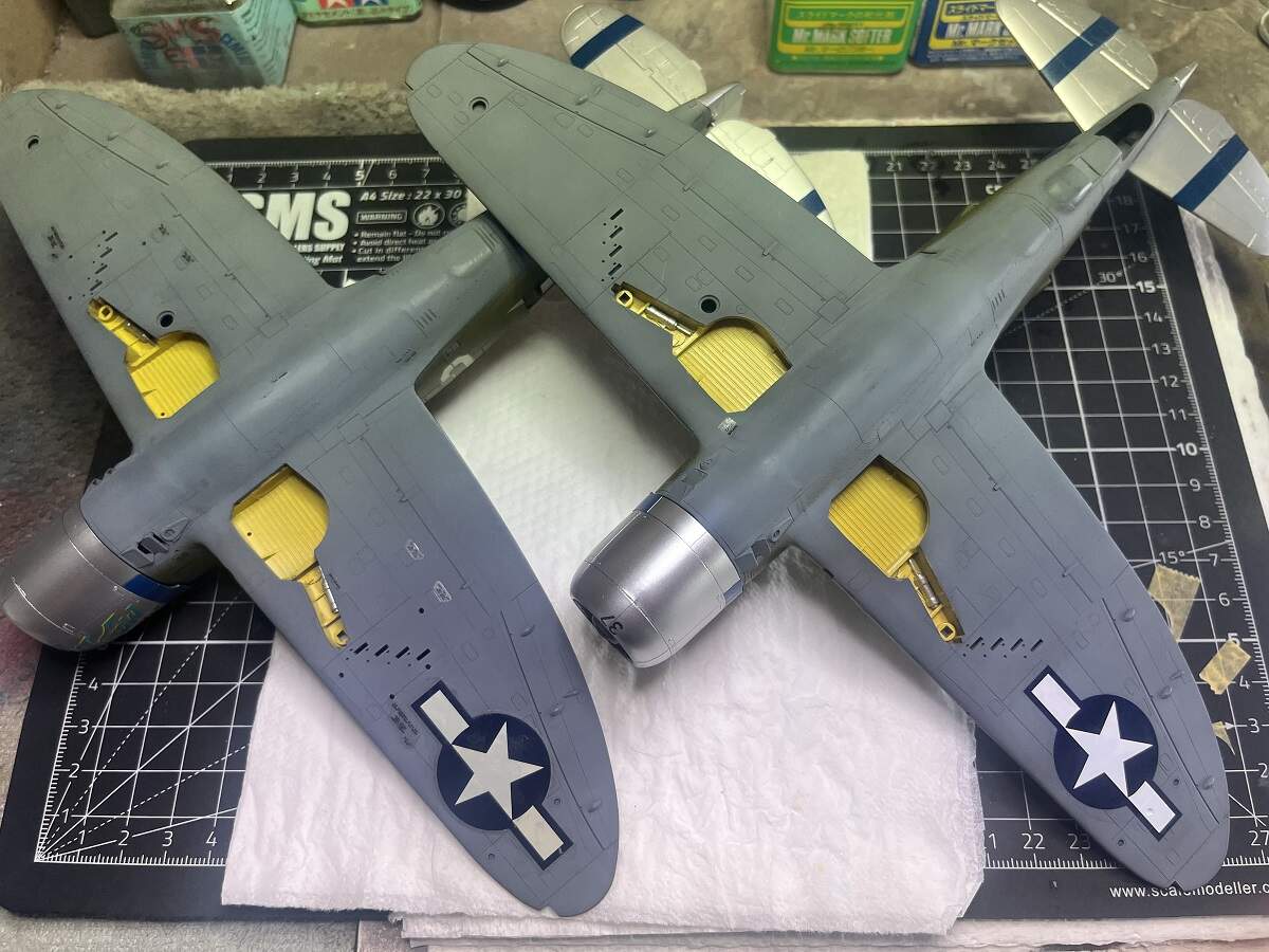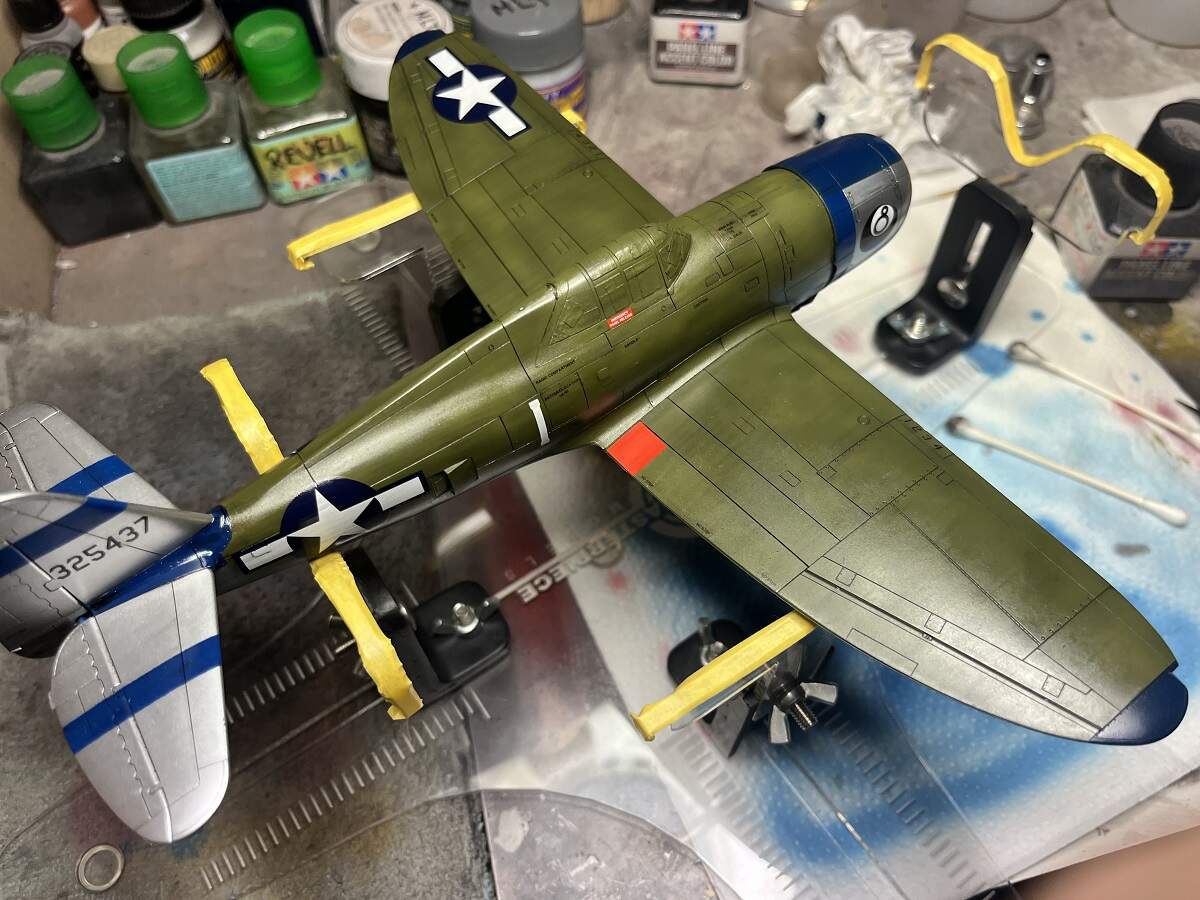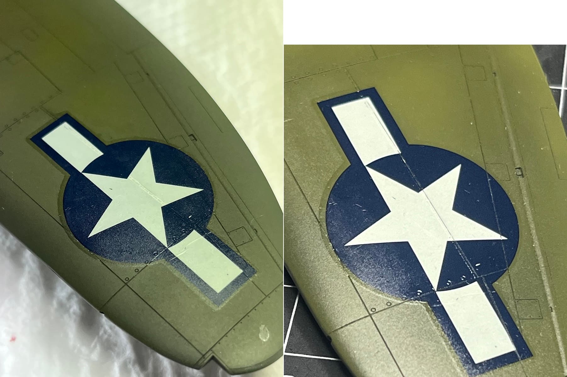 So, course of action now is to remove the kill markings on âMiss Mary Louâ first up, then clear coat both kits to protect the decals, then mask and paint the revised blue areas. Also noted that the Tamiya X-4 is too dark, my plan is to lighten it with some white oil paint as a dry rub to get a faded paler blue after the final flat clear is applied.