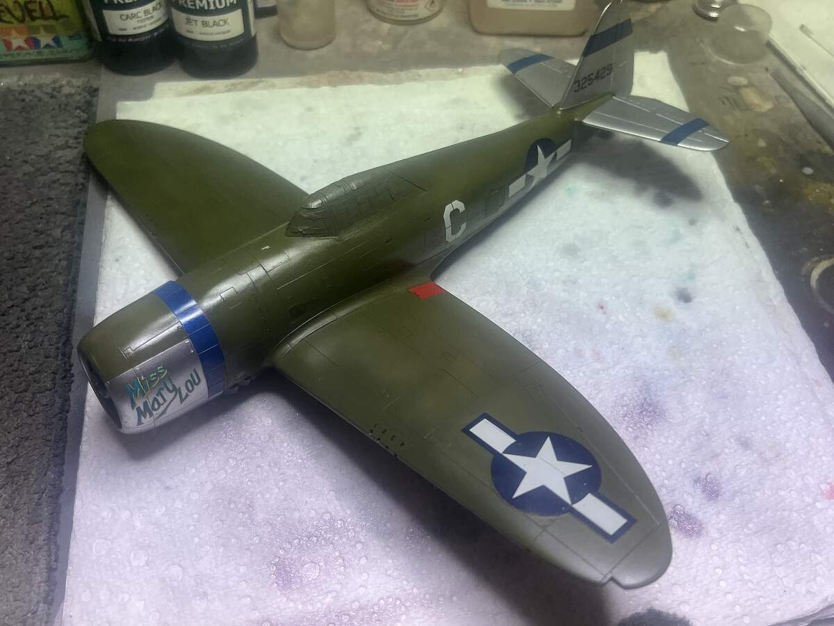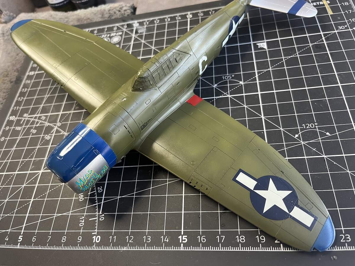 Starboard side and upper wings on âMiss Mary Louâ all done. Once again the nose art gave me a bit of grief but nothing that couldnât be overcome. A couple of underside markings and stencils then the main assembly is ready for a satin clear.