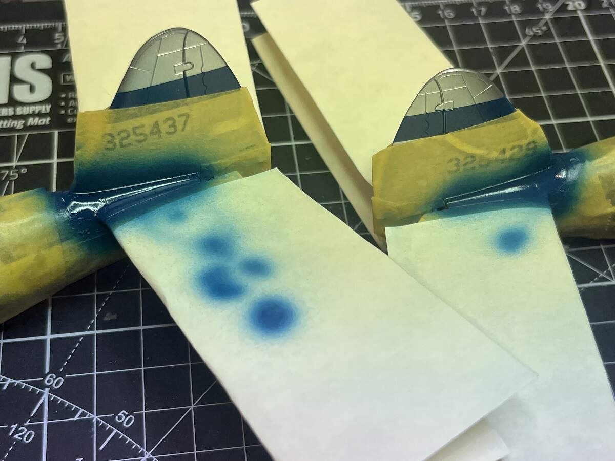 I will mask up for the Blue areas on the cowl, wing tips and tail area next.
