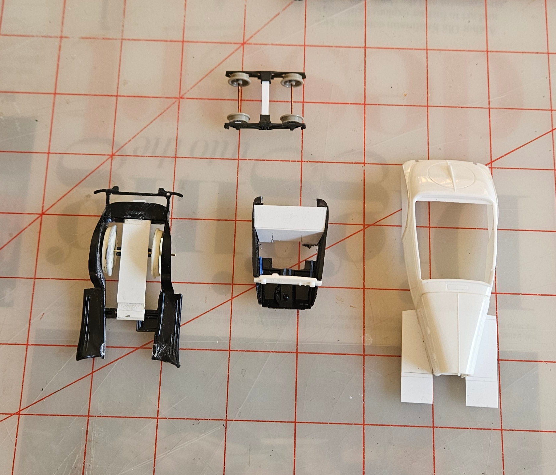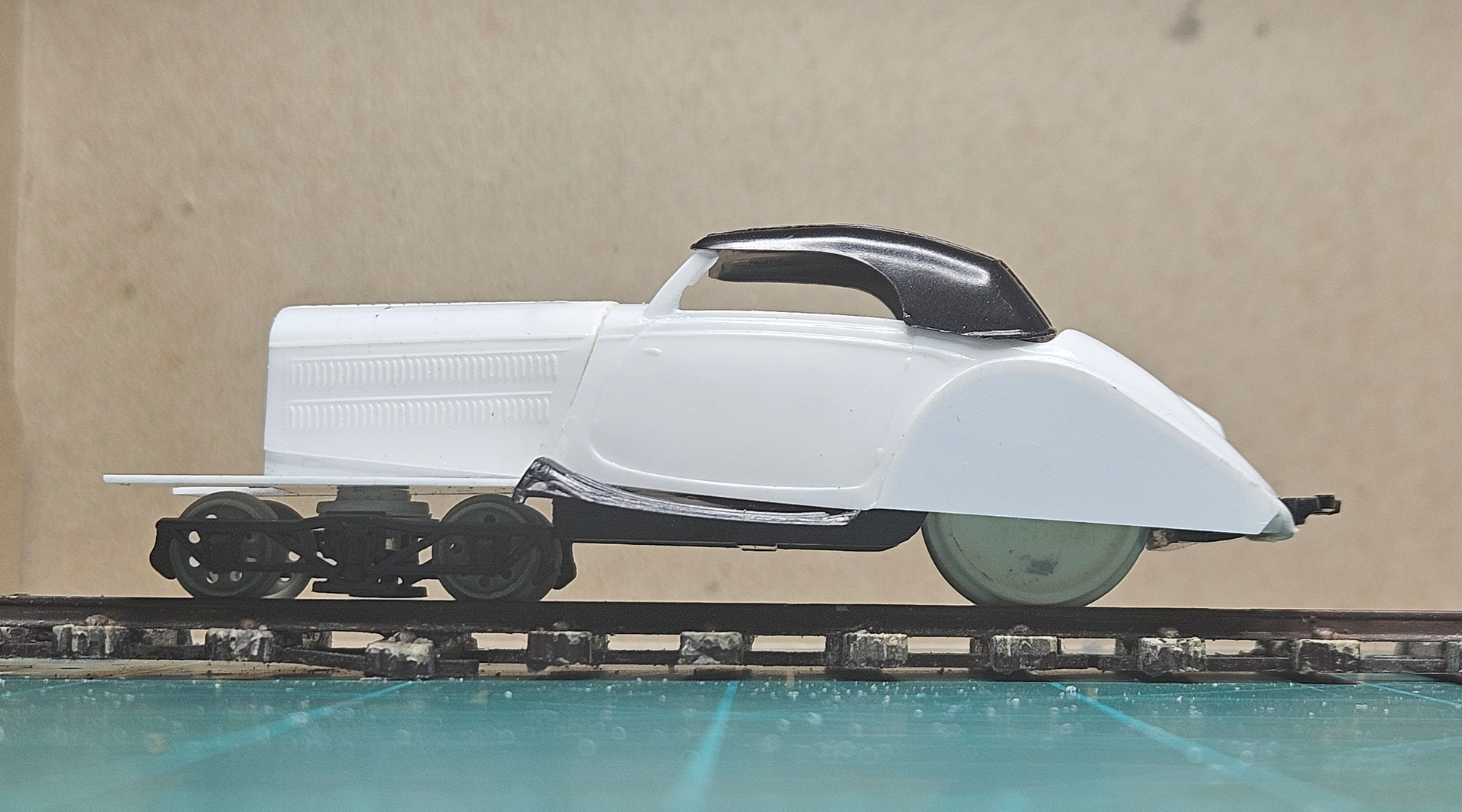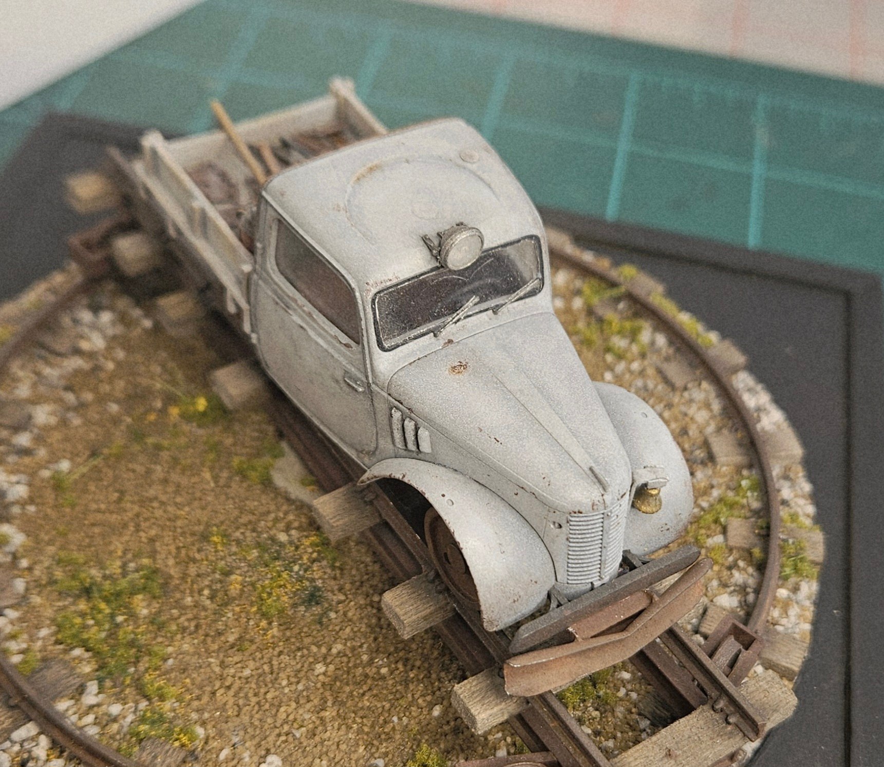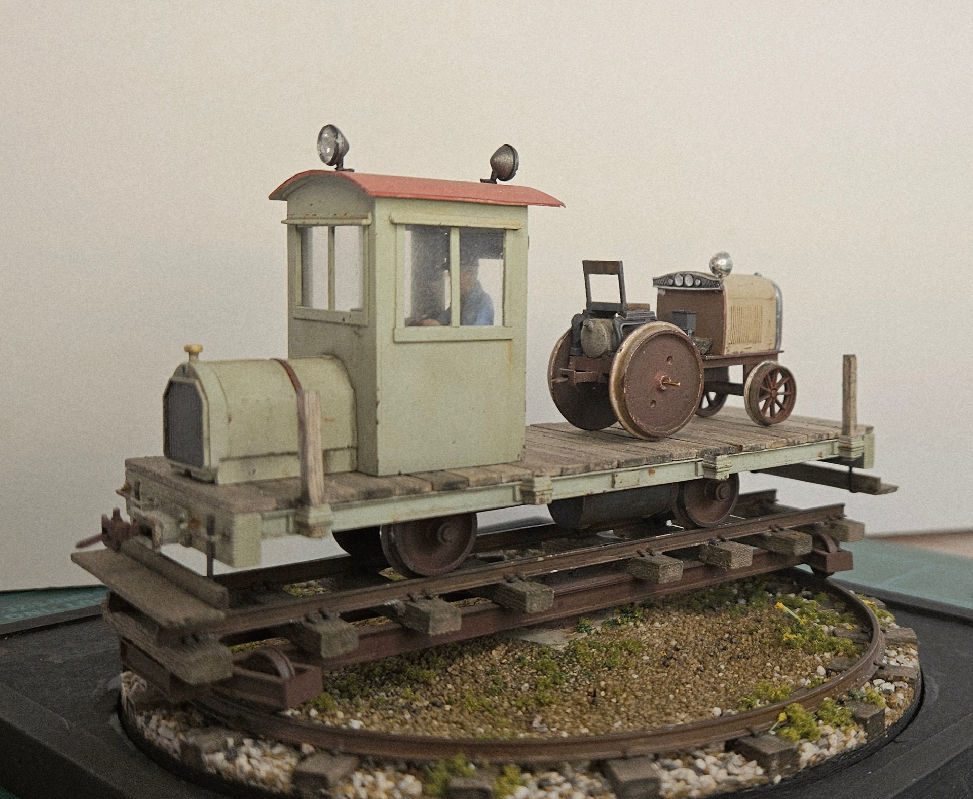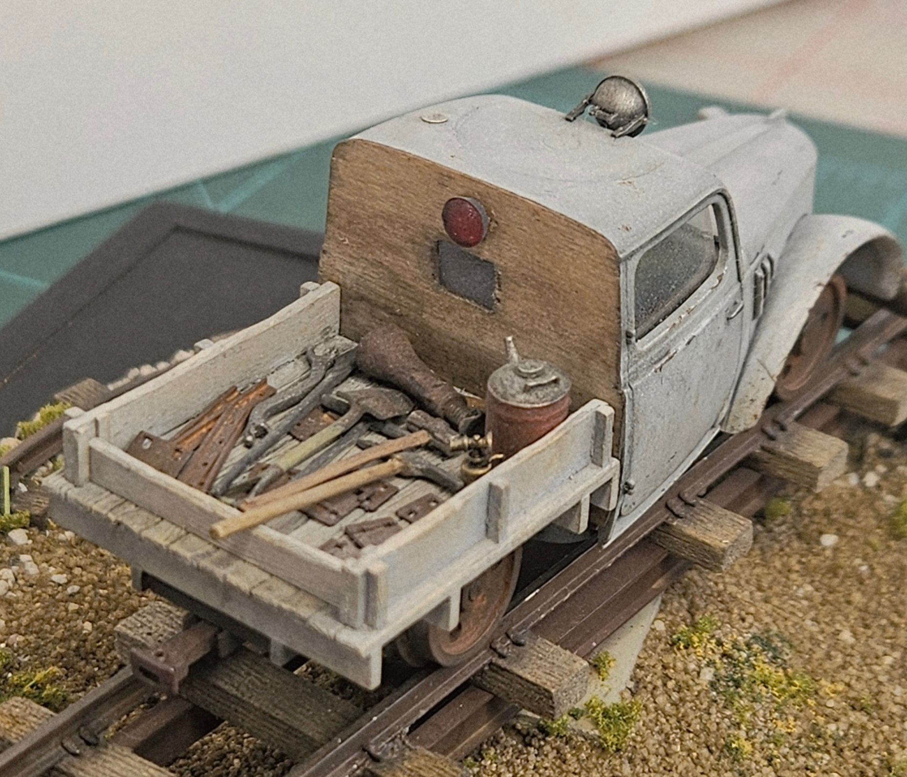 Not much to tell after that. Some .020 styrene for the front “fenders” , some wheels from a Wiseman kerosene locomotive, a little Tamiya paint and its done…