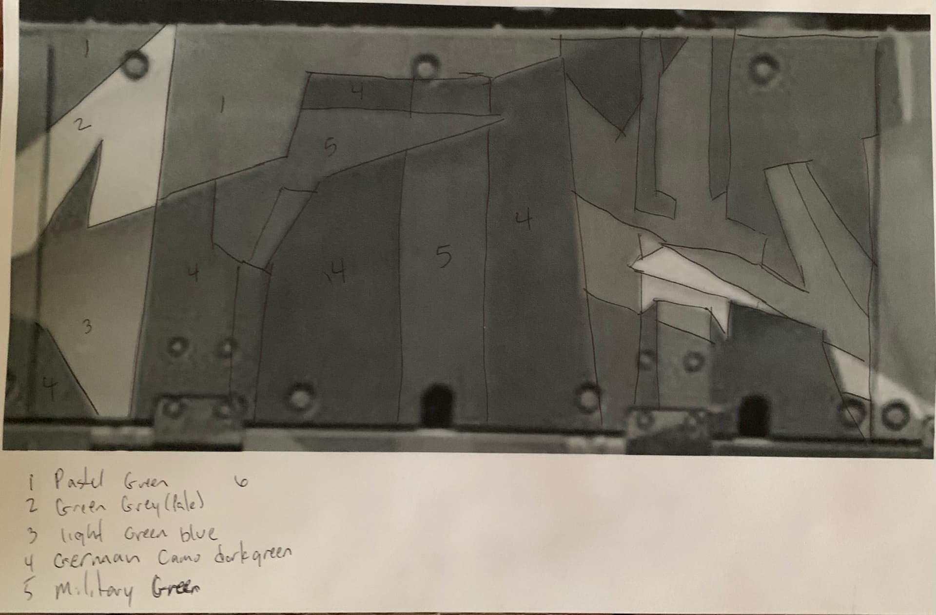 I would use a computer program/app to scratch out the pattern and colors. Outside of that I would print out the photos in color, outline the areas and do a paint by number system. My attempt with the left side on a black and white photo. I used an app for my eye matching of Vallejo colors. I wouldn’t trust my mk.1 eyeball. Just an example of how to tackle the issue. I would also try on a larger scale to work out the details on a plastic sheet before scaling down to whatever scale you want.