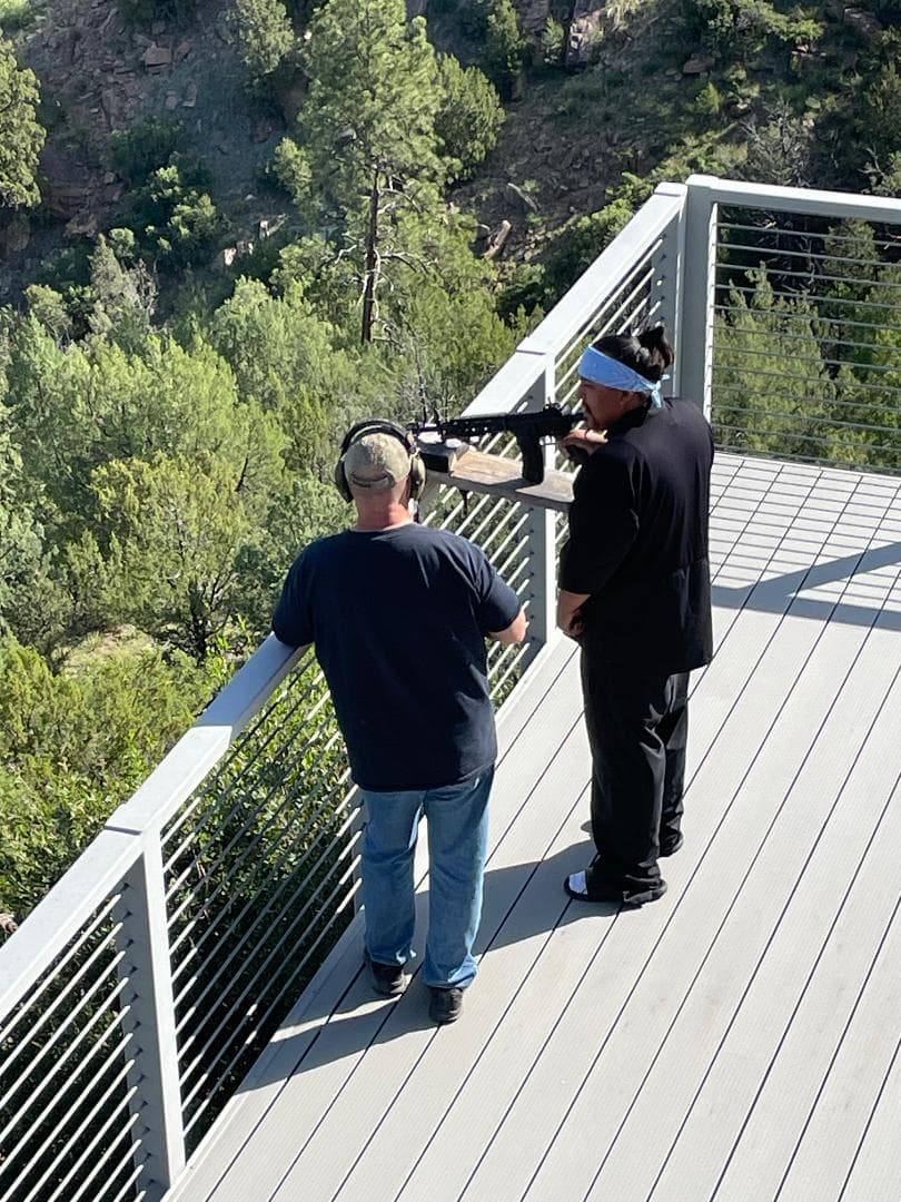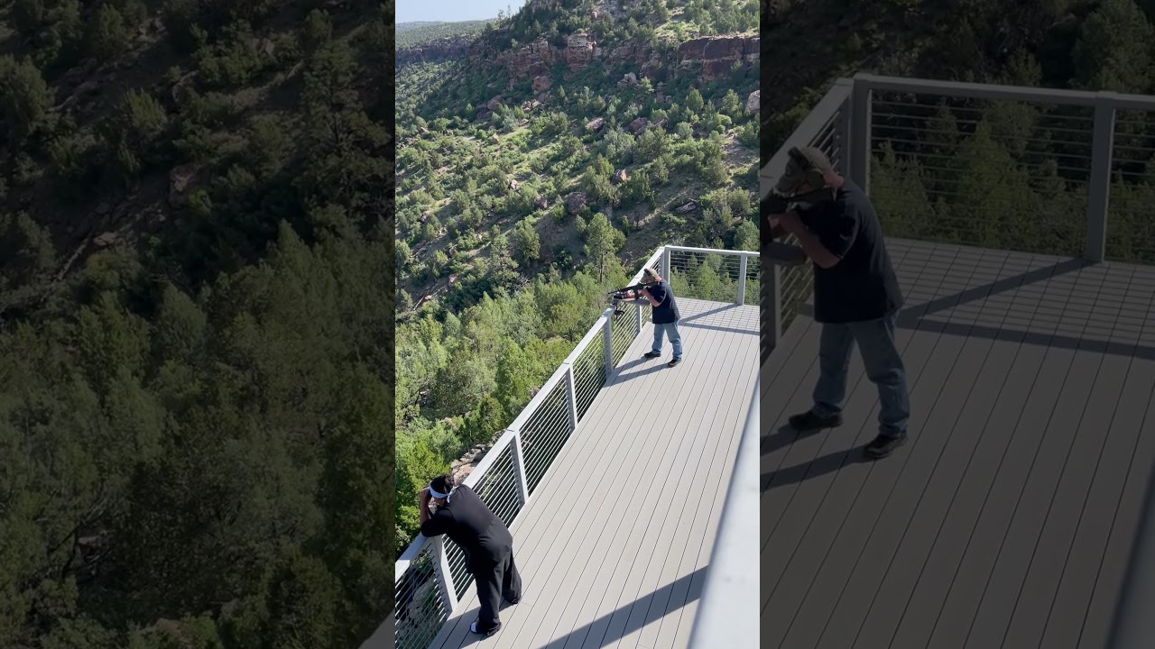 I appreciate the ability to shoot long range, but itâs not been something that was necessary for me. It is indeed something I might like to try my hand st someday. For now I continue to concentrate more on closer range shooting, although I could not pass up todayâs challenge - steel plate on the opposite side of the Canadian River Canyon, 485 yards away, and probably several hundred yards lower than my position. Iron sights, aimed about a meter high. Tagged it evey time. Decided to show off to my wife - one shot, offhand, also a hit. Itâs not often you can shoot off of your balcony after a nice sunrise breakfast.