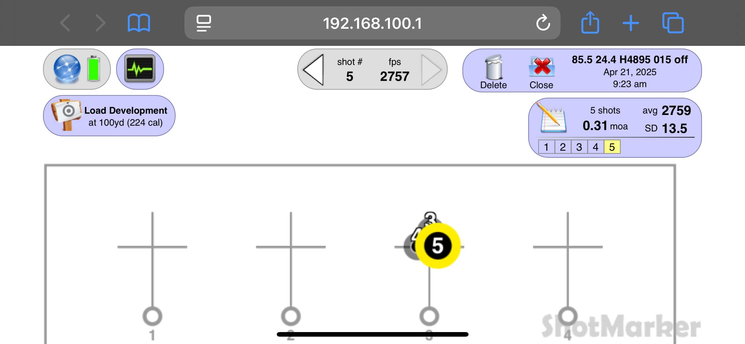 Note that I forgot to change caliber back from .264 (6.5mm) to .308 after I recalibrated the target for the season the previous Thursday at NVGC and the bullet speed at the target (To the right of the 9).