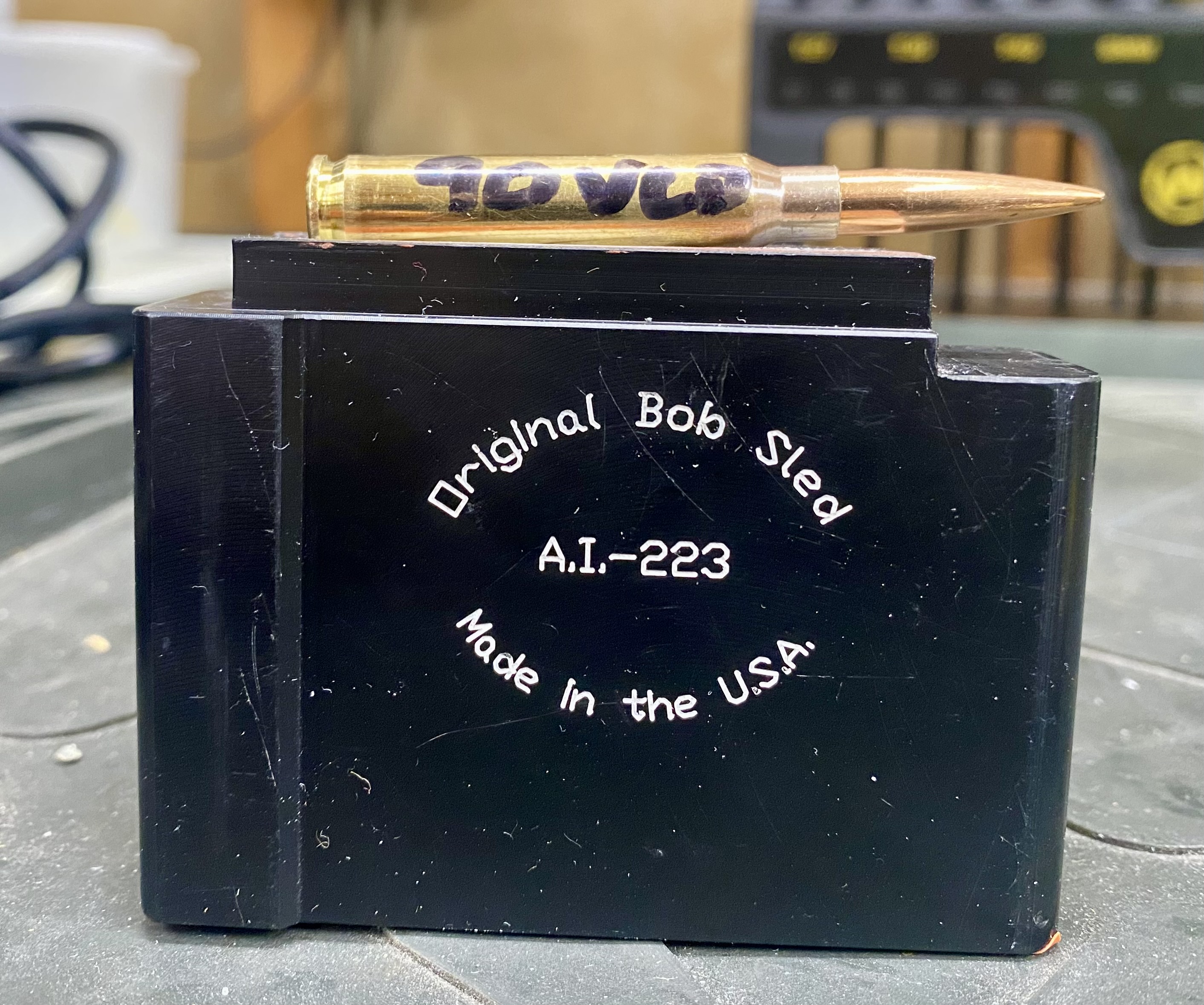These long pointy rounds will never feed from a magazine and will crash into the feed ramp or the barrel tenon with a regular sled, so I modified it with some .020 evergreen, black Starbond and some spot putty. Sanded the angle with 240 grit wrapped around a 5.56 case