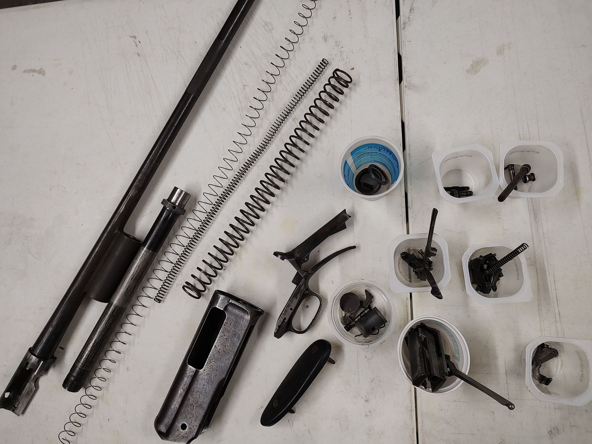 One hundred- and 13-year-old Winchester Model 1911 S.L. (Self-Loading) shotgun in 12 ga. completely disassembled and ready for detailed cleaning and rust conversion work. The fore end and stock are not shown, but both of those also need some repairs and refinishing.