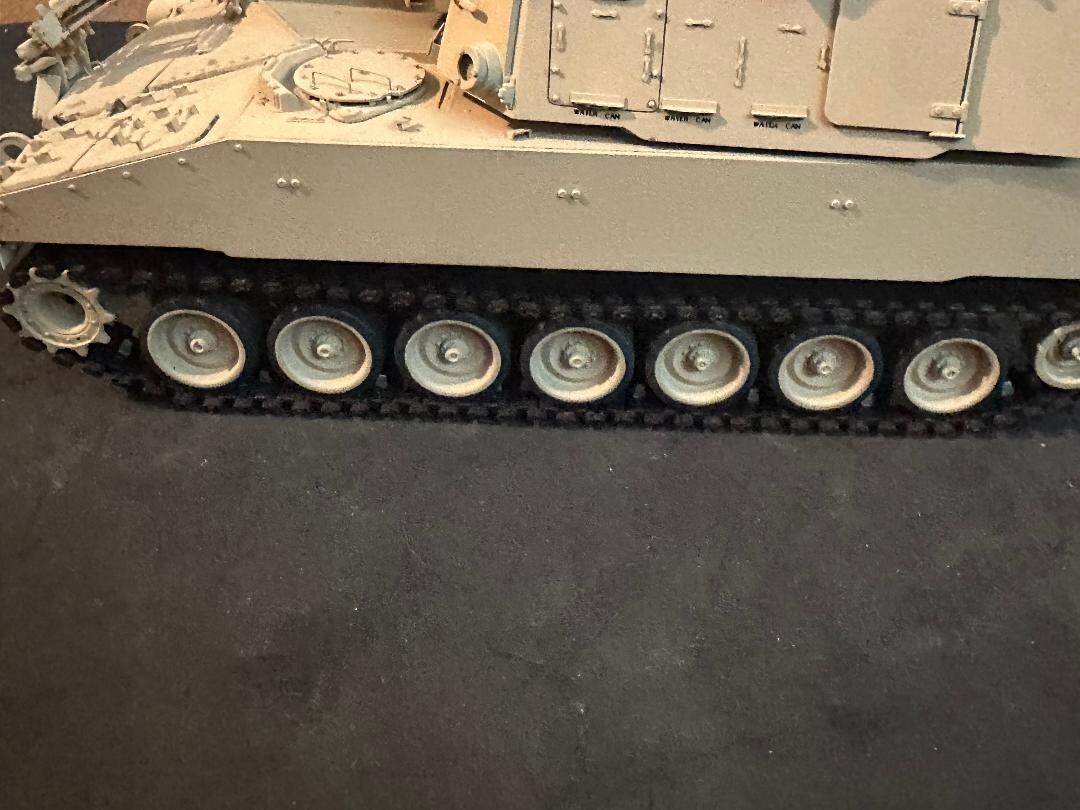 Unusual weathering of track, or lack thereof, based on the fact that this example had newly arrived at Fort Hood when I originally photographed it. Lotta work went into correcting the Italeri kit…